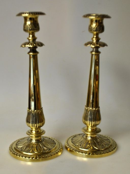 Par franske lysestager i messing, 19. årh. Tidligere forsølvet. H.: 25,5 cm.