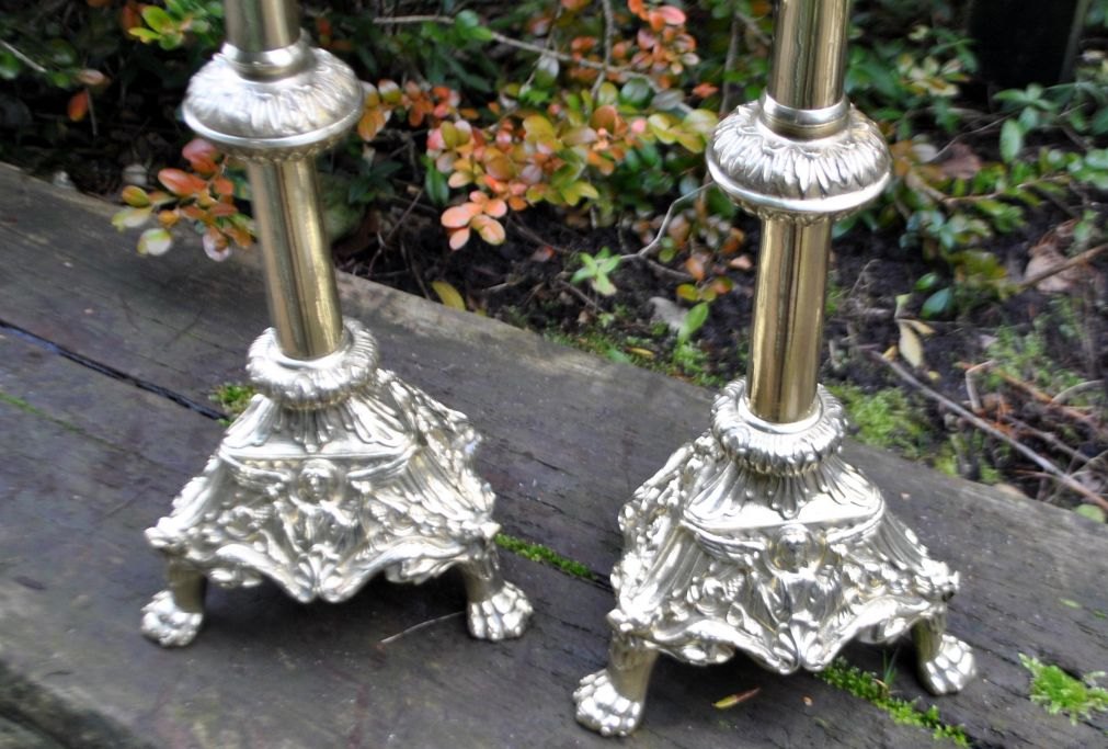 Par franske kirkestager i messing, 19. årh. Med løvefødder. Fodstykke med engle. H.: 40 cm.