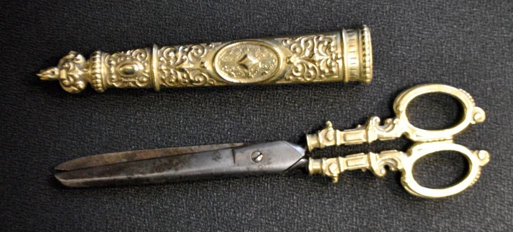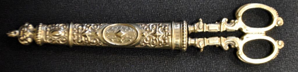 Messing saks i dekoreret messinghylster, 1880. L. 26,5 cm.