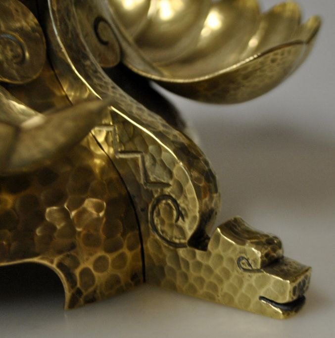 Stort messing blækhus, art deco, ca. 1920, Danmark. Med dragefødder. Hamret. Indvendig ed glas blækhus. H.: 14 cm. Dia.: 22 cm.