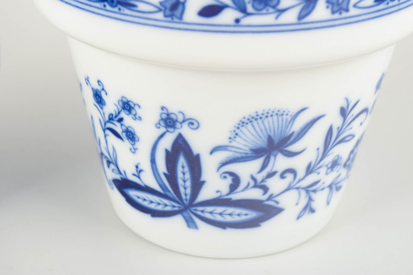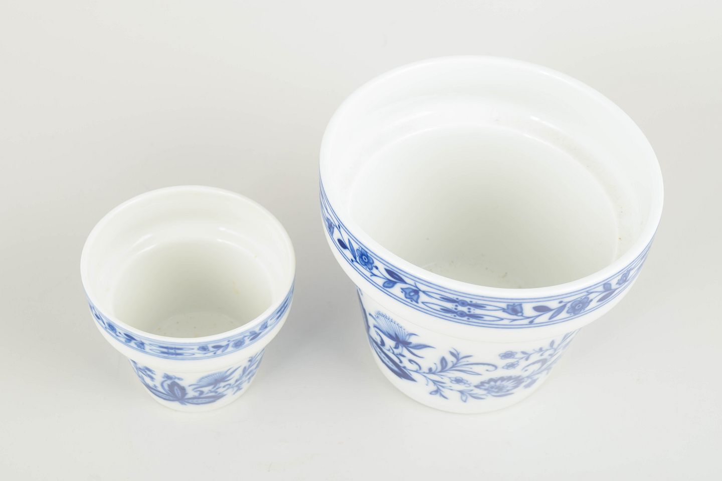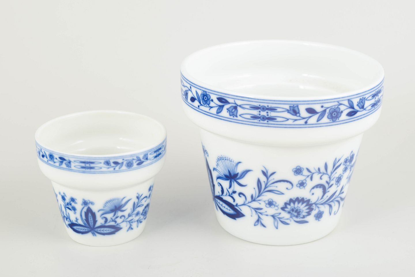To klassiske urtepotteskjulere i hvidt porcelæn med håndmalet, koboltblå dekoration i traditionel stil.