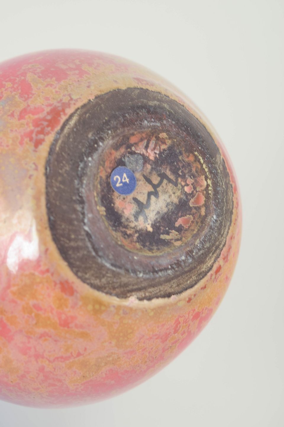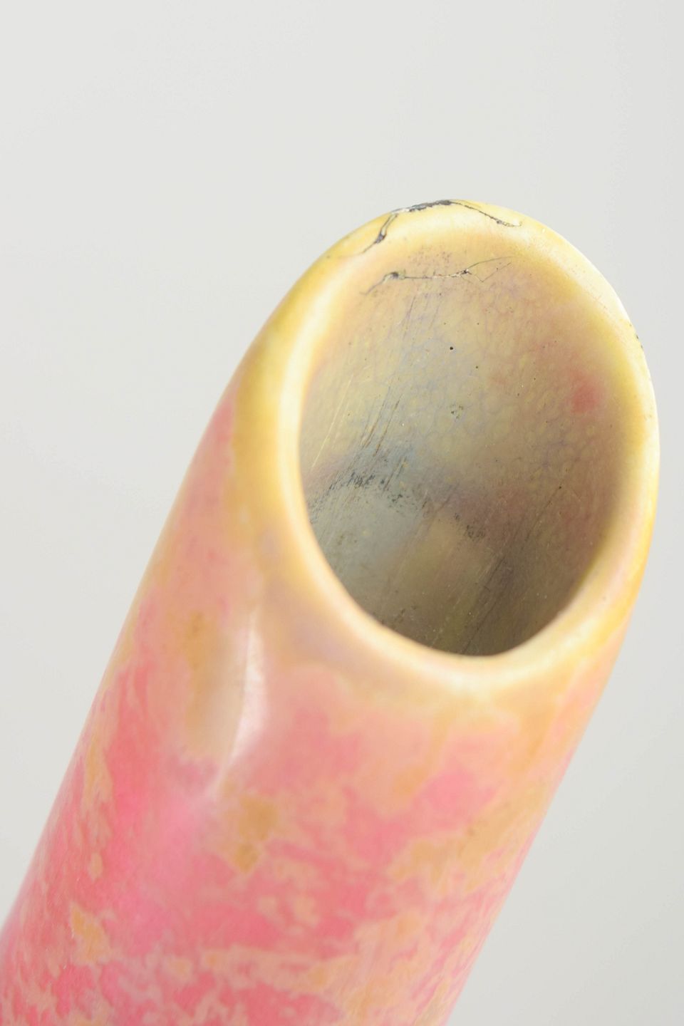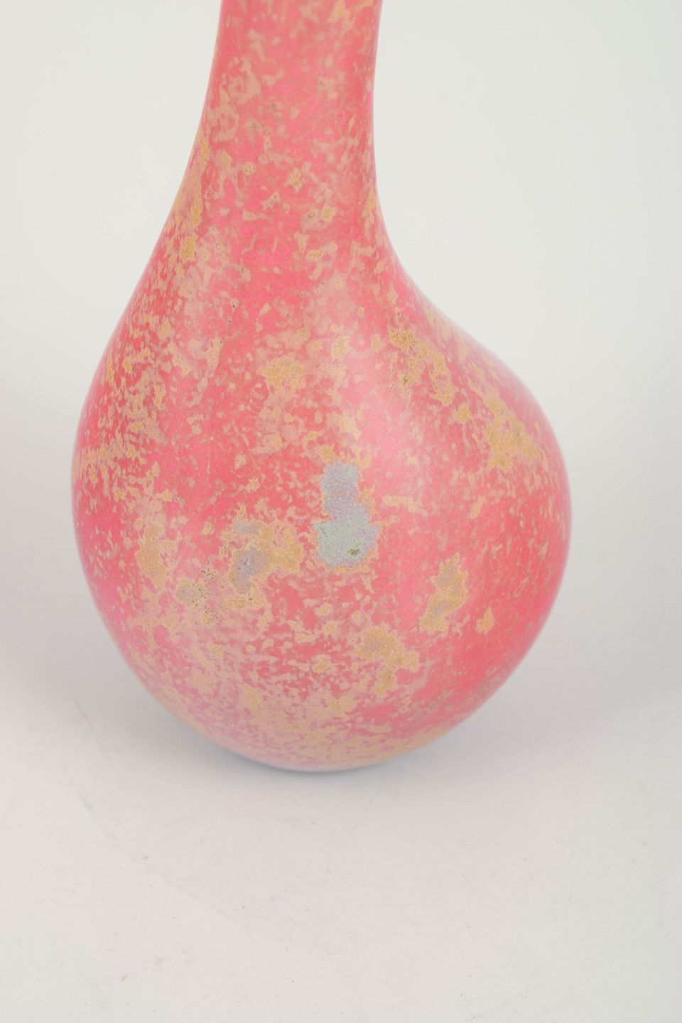 Elegant dråbeformet vase i keramik med en karakteristisk rosa og gulmarmoreret glasur. Den slanke hals og det bløde volumen giver formen et skulpturelt udtryk.