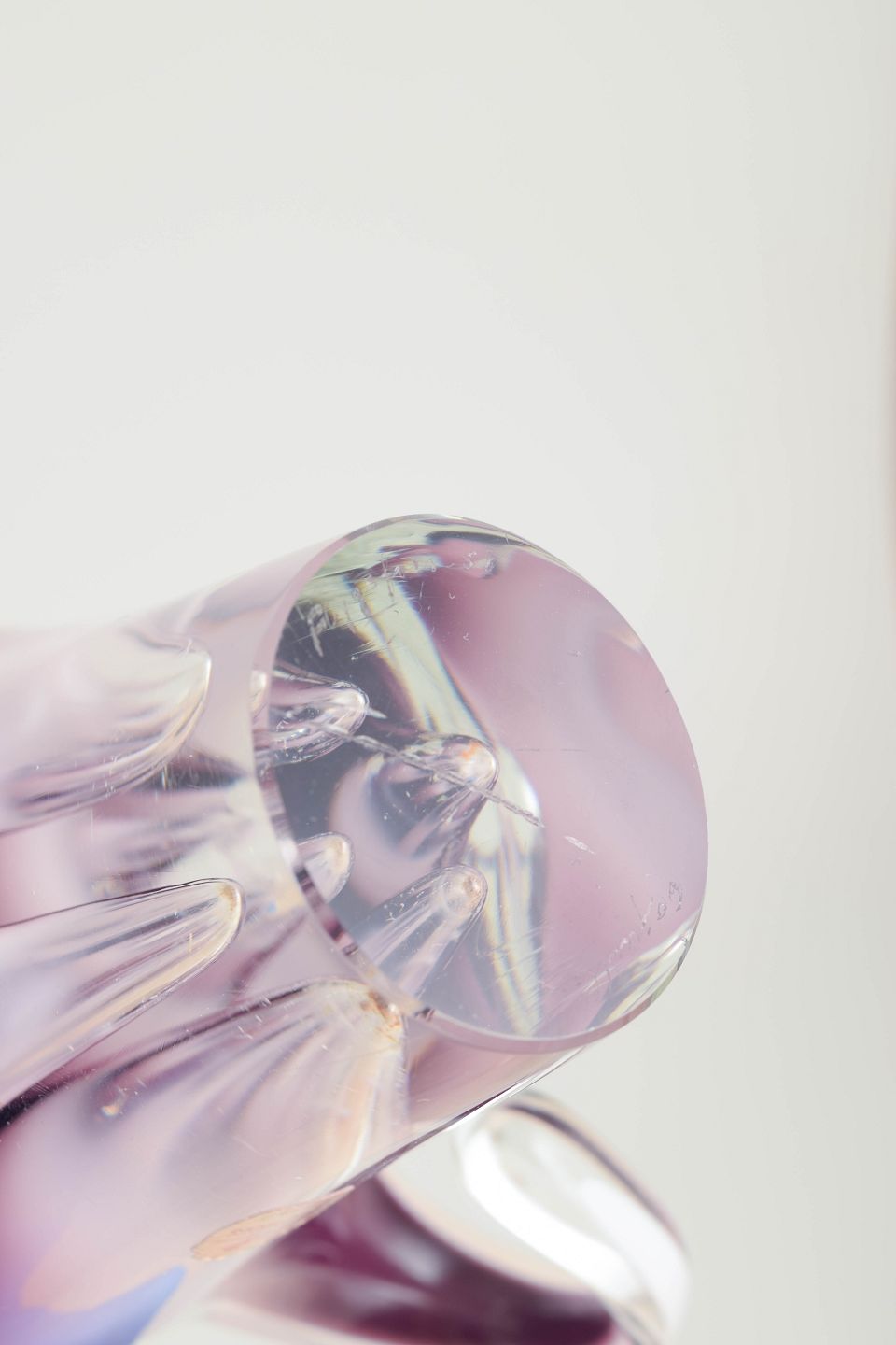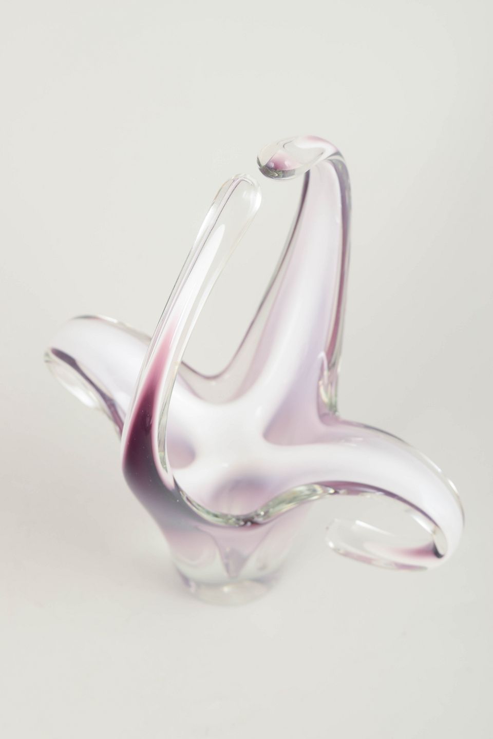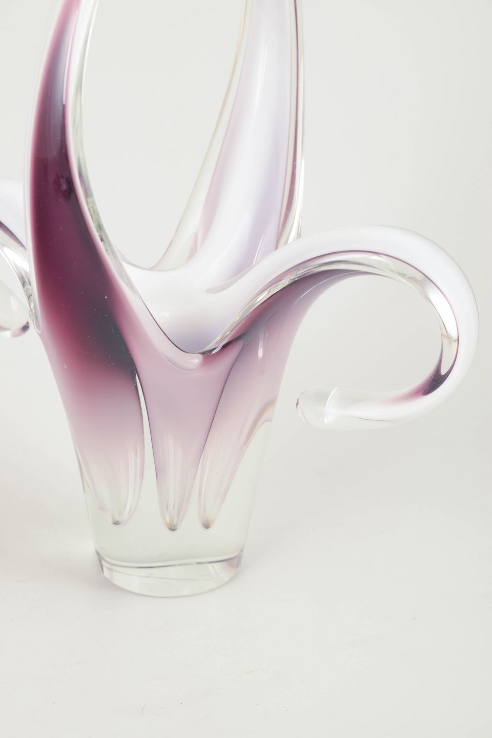 Stor og dramatisk “Coquille”-form i flerlaget kunstglas med lys rosa til violet farvegraduering, hvidt mellem­lag og klart yderglas. De opadstræbende, bølgende arme giver et elegant, blomsteragtigt og skulpturelt udtryk – et af Kedelvs mest karakteristiske formsprog.