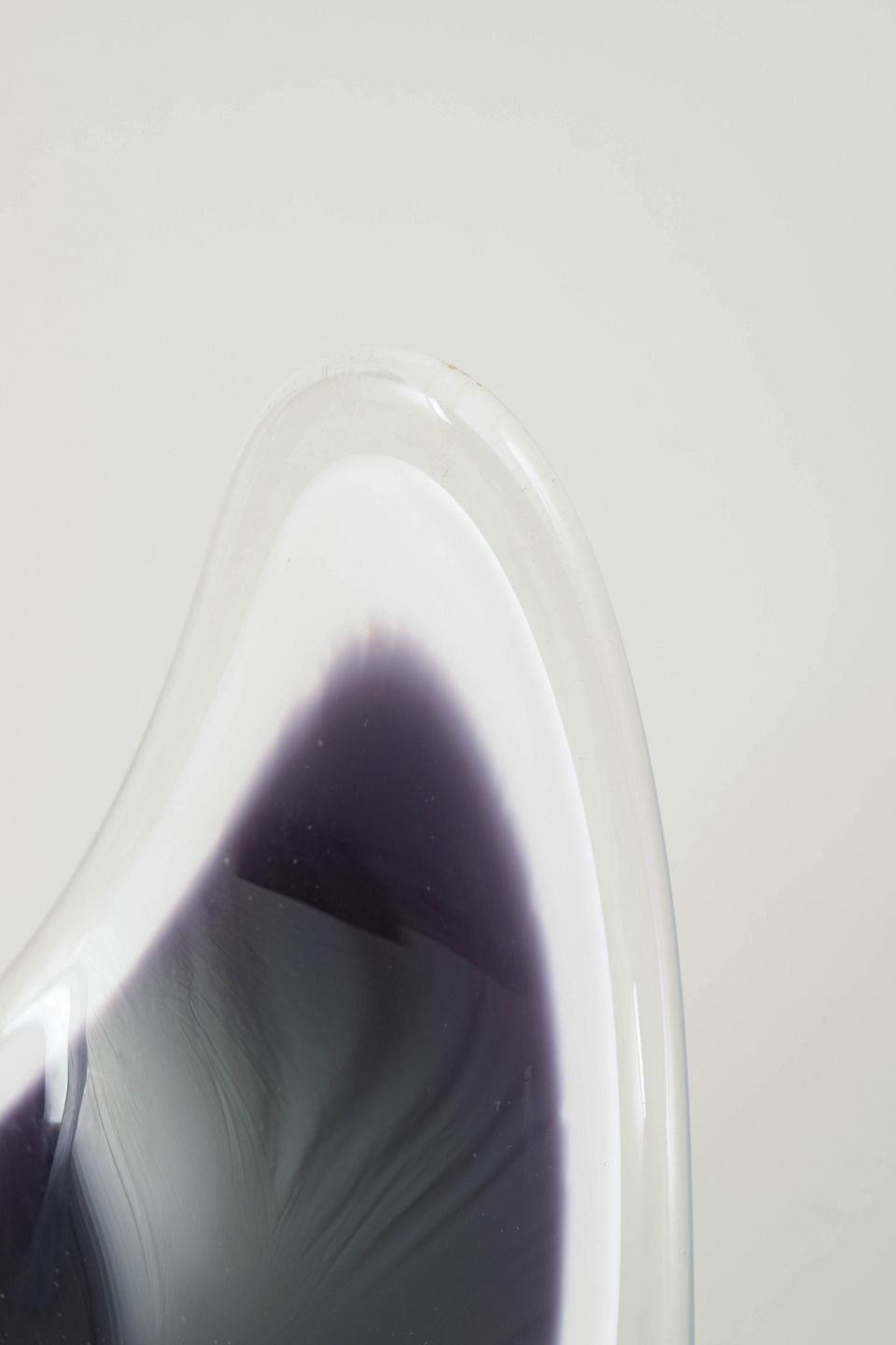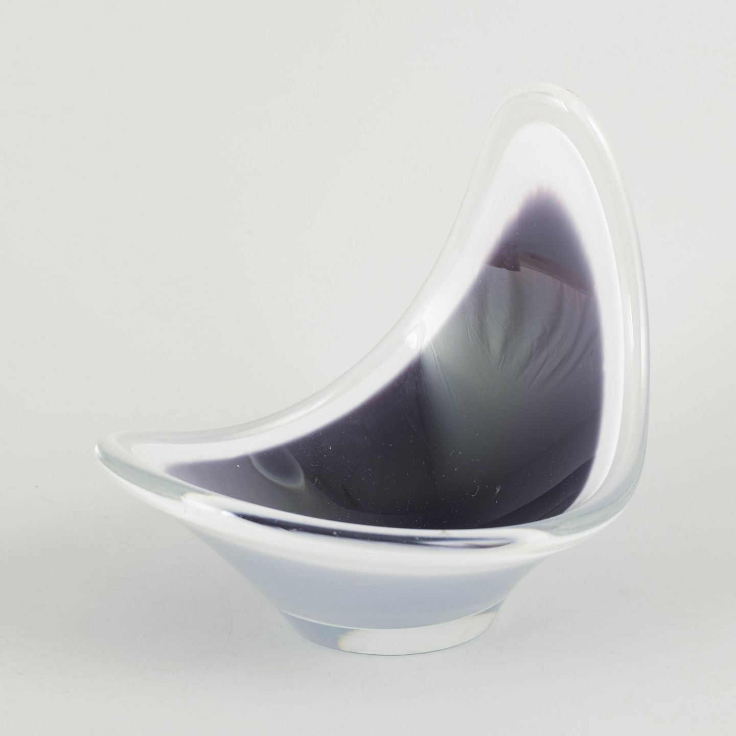 “Coquille”-skål i flerlaget kunstglas med dyb grå/sort indfarvning og hvidt mellemlag, omsluttet af klart yderglas. Den asymmetriske, opadbuede form er karakteristisk for Kedelvs organiske mid-century design.