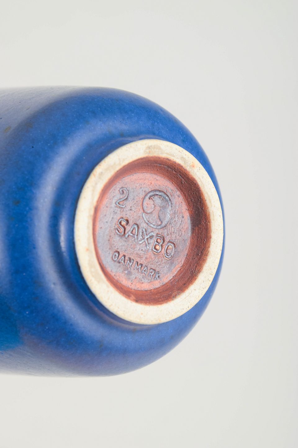 Elegant cylindrisk stentøjskrukke i karakteristisk Saxbo-blå glasur, monteret med et massivt sterling sølvlåg udført i Aage Weimars organiske, skulpturelle formsprog.