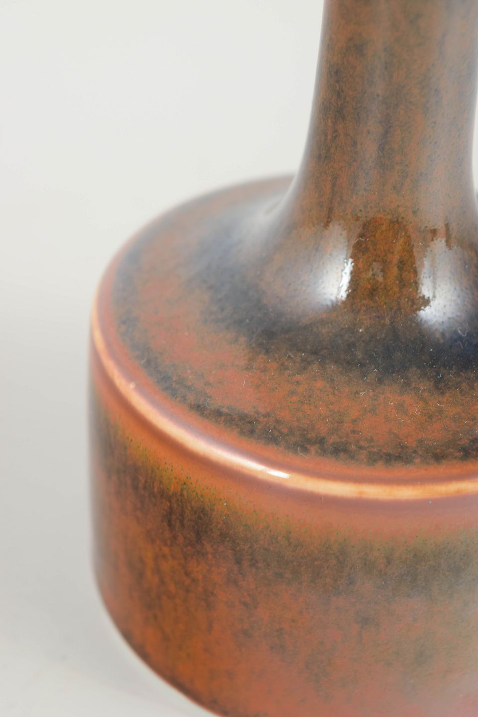 Elegant cylindrisk vase i glaseret stentøj med høj, slank hals og varme brun-røde og mørke nuancer i en karakteristisk Stålhane-glasur.