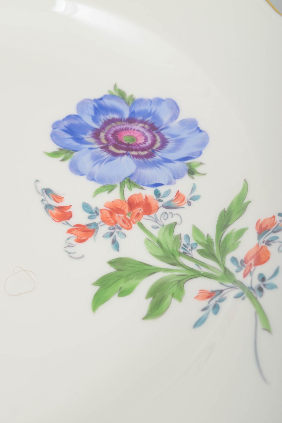 Meissen, grundlagt i 1710, var Europas første hårdporcelænsfabrik og satte standarden for håndmalet porcelæn gennem hele 1700- og 1800-tallet. Blomsterdekorationer – særligt de naturalistiske buketter – var blandt manufakturens mest efterspurgte motiver. Meissens arbejde fra slutningen af 1800-tallet er kendetegnet ved detaljerigdom, teknisk perfektion og en fortsat fastholdt tradition for forgyldte rande og klassiske former.