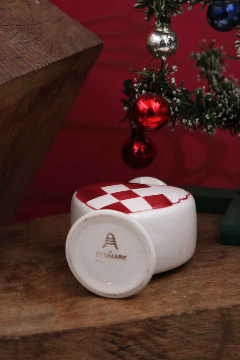 Gammelt rødt Aluminia fajance julehjerte til lille stearinlys.