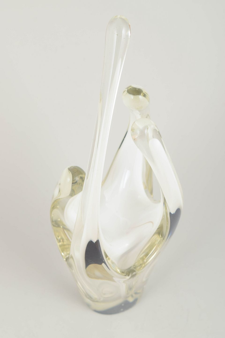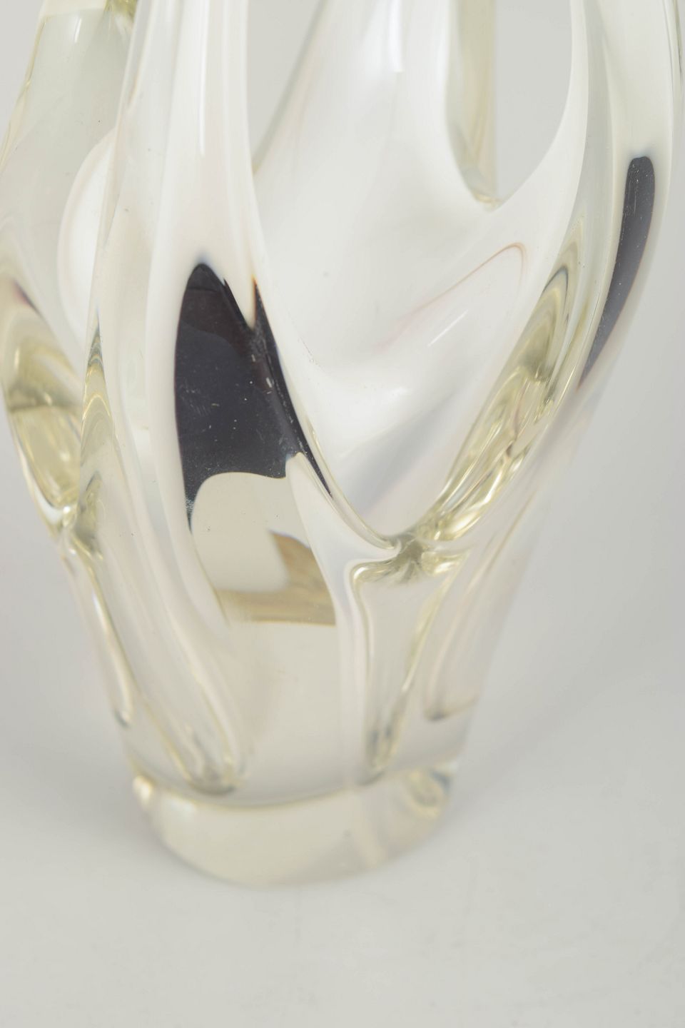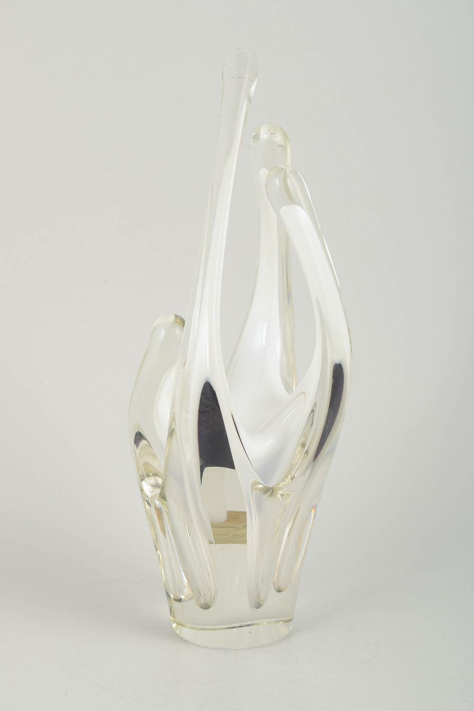 Organisk og skulpturel kunstglas vase i klart glas med indre hvid kerne, mundblæst i den karakteristiske opadstigende Coquille-form. Et tidligt og elegant eksempel fra midten af 1950’erne.