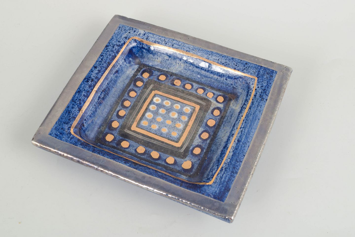 Rektangulært, lavt fad i håndlavet keramik med Pelletiers karakteristiske geometriske dekoration i blå, okker og hvid.