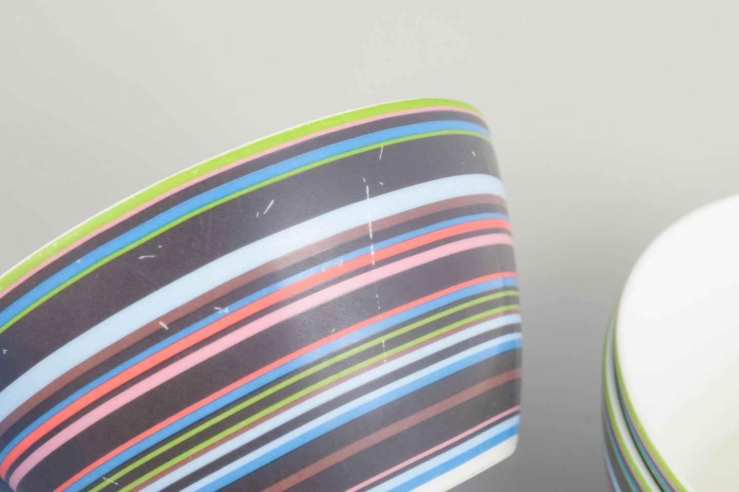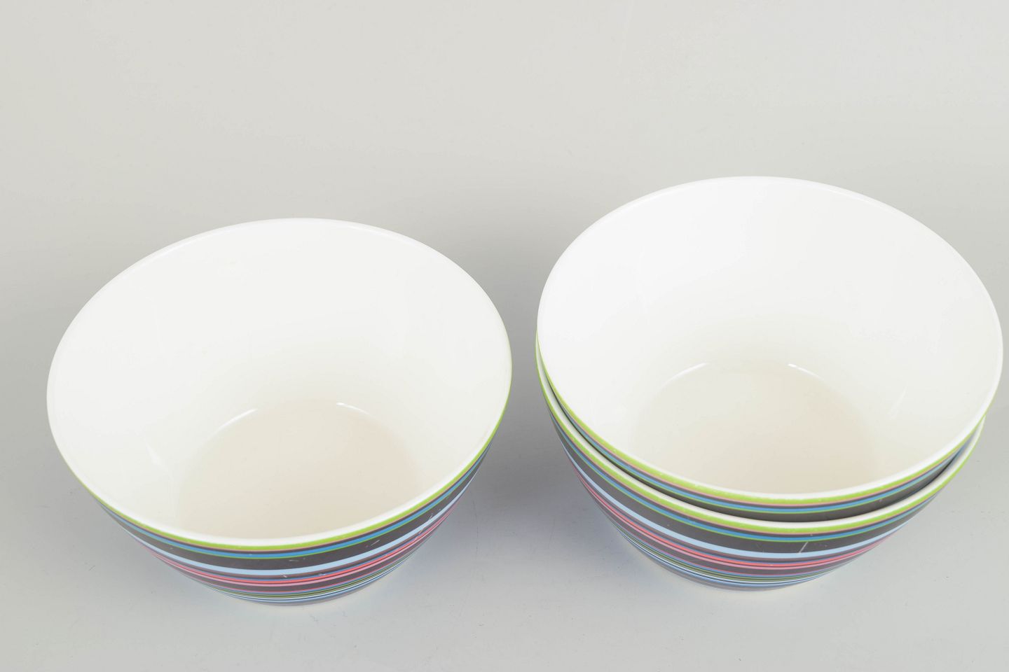 Tre farvestrålende skåle i porcelæn fra den ikoniske Origo-serie, dekoreret med de karakteristiske flerfarvede, horisontale striber. Lettere brugsspor og ridser i dekoren, jf. fotos.
