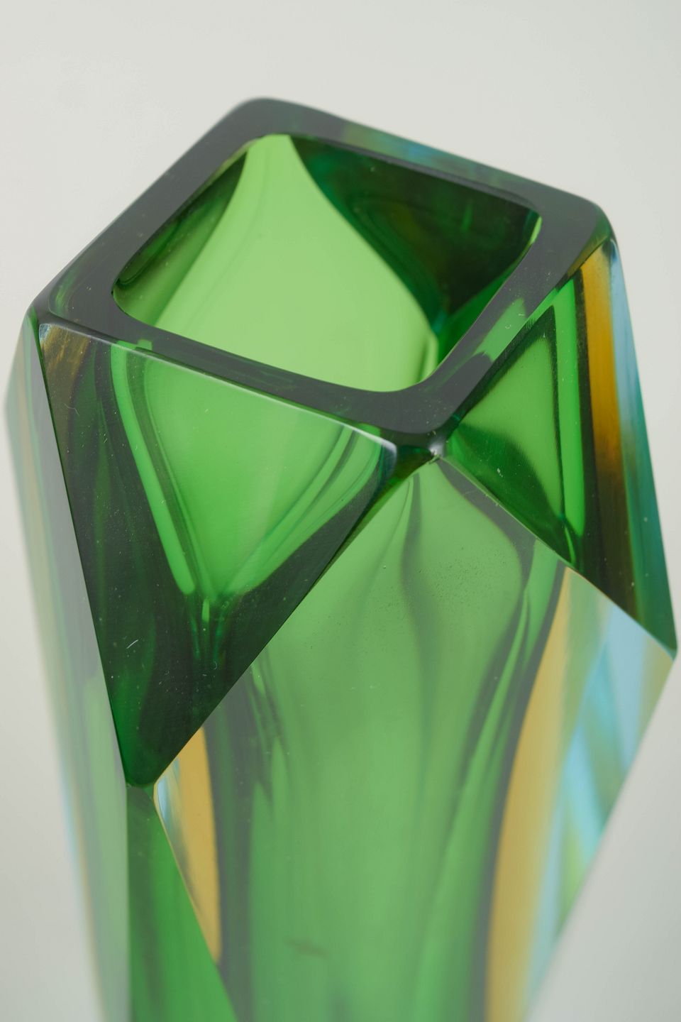 Elegant, geometrisk skåret sommerso-vase i lagdelt Murano-glas med klar/turkis ydre masse og intens grøn indre kerne. De mange slebne flader giver stærke lysbrydninger og et markant skulpturelt udtryk, typisk for Mandruzzatos håndværk i perioden.