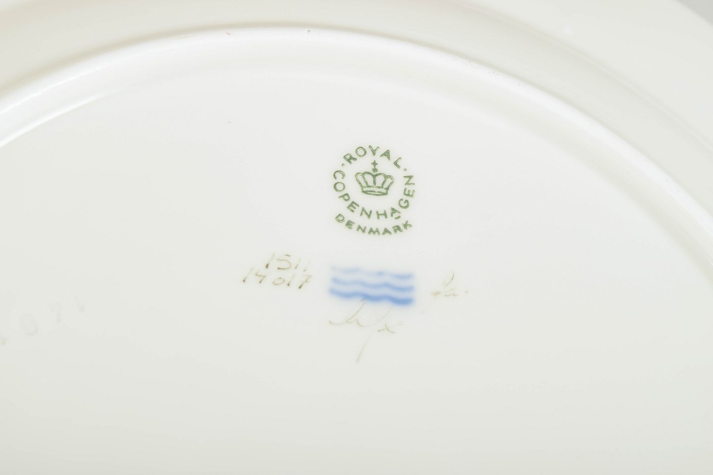 Sjældne, store tallerkener i porcelæn med bred blå kant og fine håndmalede blomsterdekorationer. Klassisk Royal Copenhagen-æstetik i et rent og elegant 60’er-udtryk.