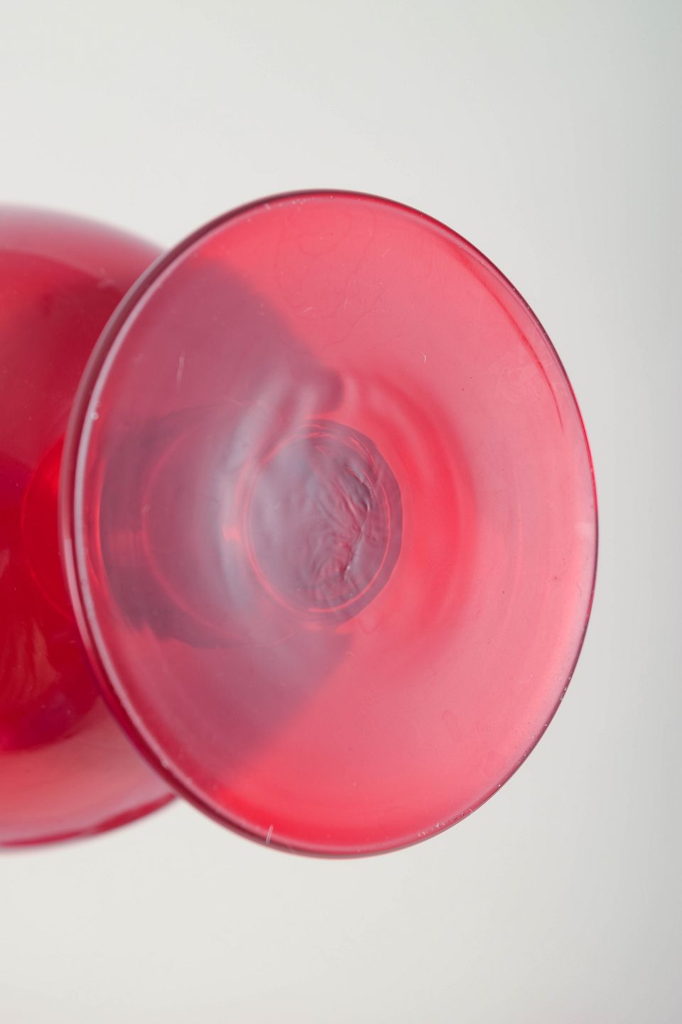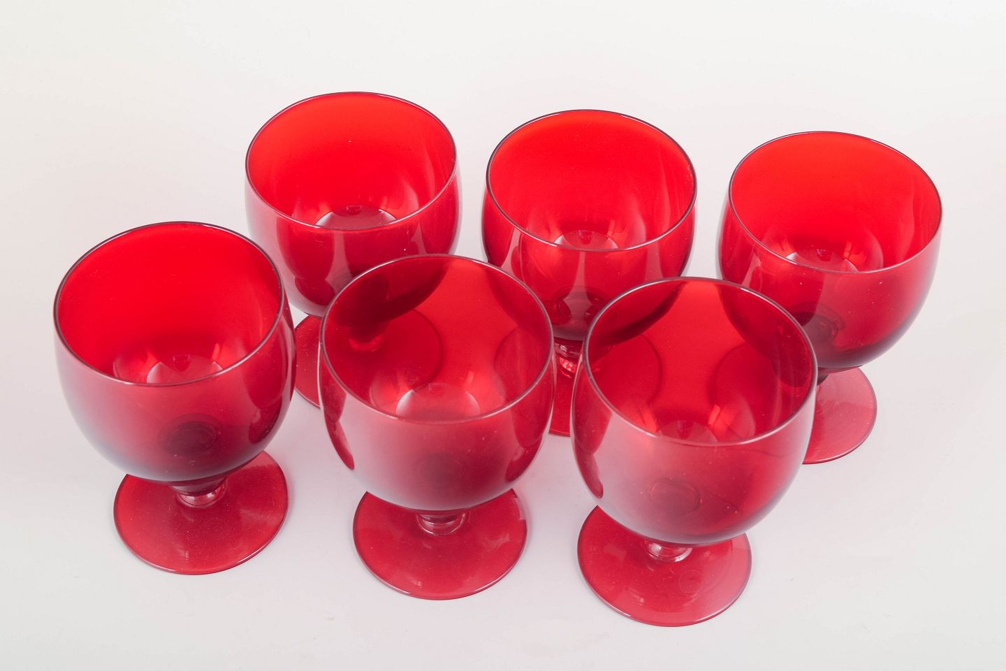 Sæt af seks rubinrøde rødvinsglas i klassisk form med rund kupa og profildrejet stilk. Den dybe røde tone er karakteristisk for Reijmyres midt-århundrede produktion.