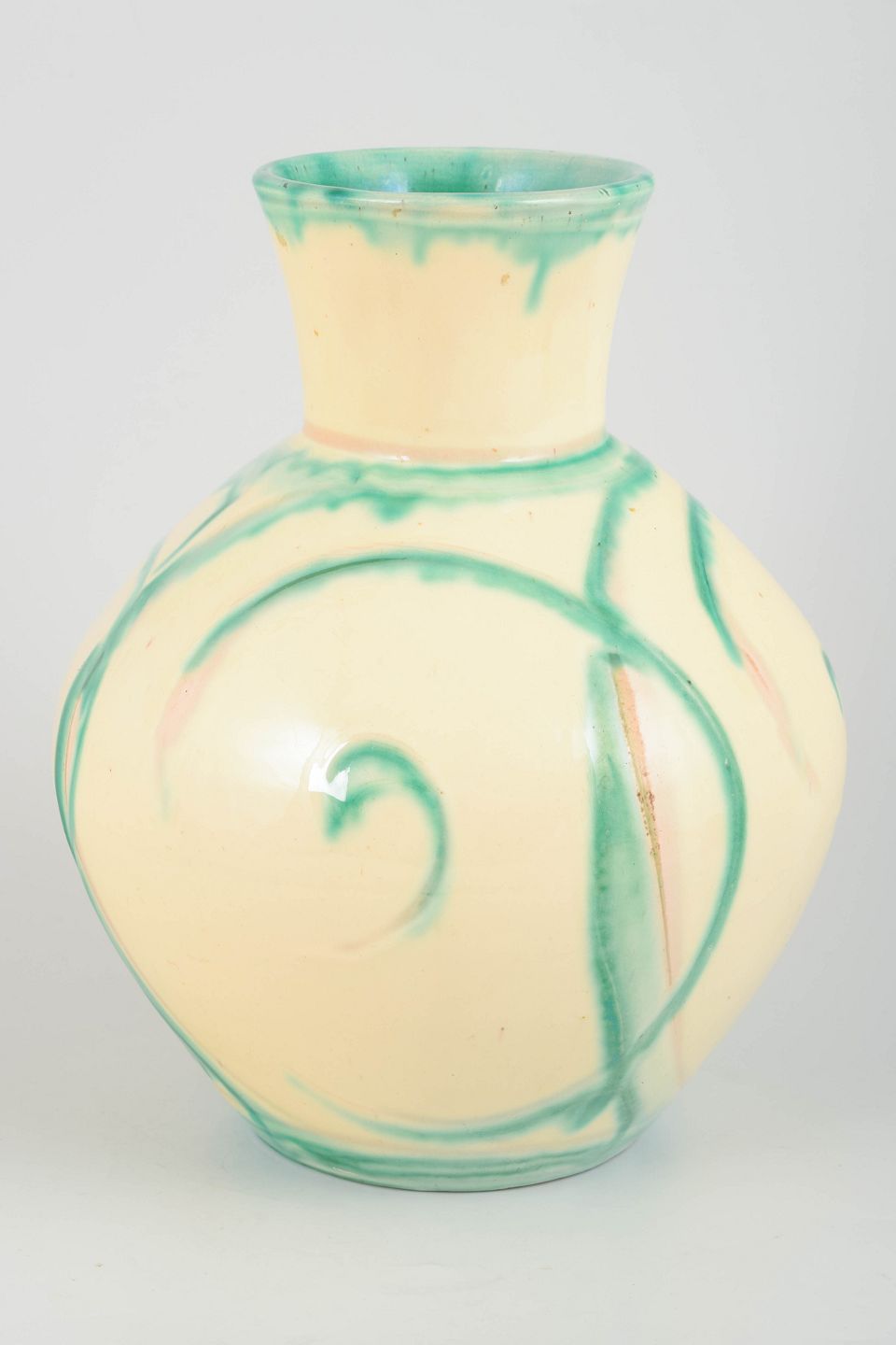 Hånddrejet keramikvase med klassisk pæreformet korpus og udsvajet hals. Dekoreret i en cremefarvet grundglasur med karakteristiske grønne penselstrøg i spiral- og drypbevægelser – et typisk udtryk for Kählers dekorative arbejde i mellemkrigstiden.