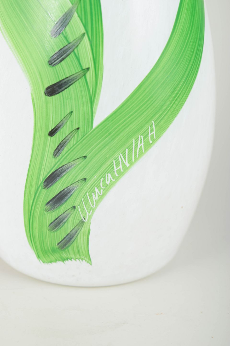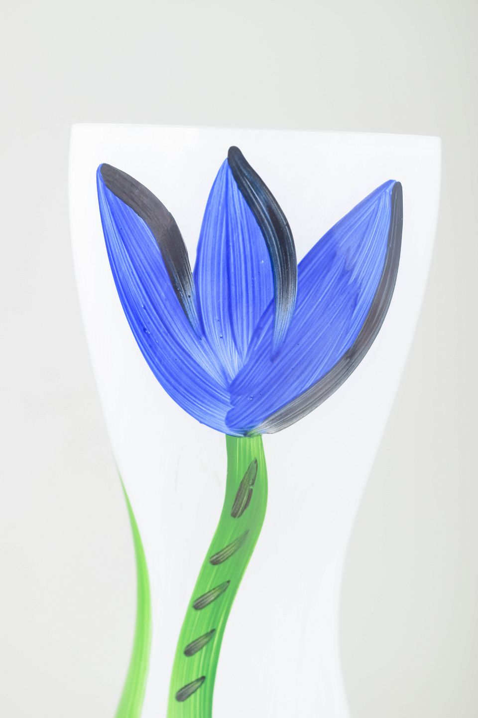 Håndmalet, organisk formet glasvase i opalhvidt art glass med karakteristisk botanisk dekoration i blå og grønne nuancer.