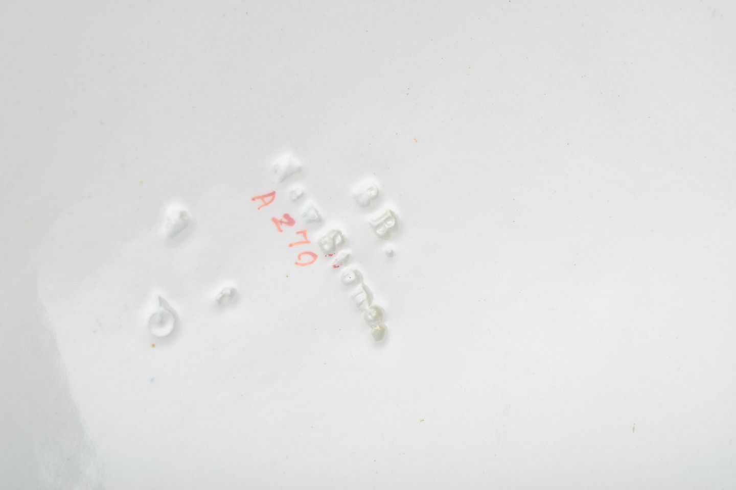 Omfangsrig suppeterrin i fajance med tilhørende underfad, rigt dekoreret i flerfarvet blomsterornamentik og fine bånd i turkise og guldtoner. Terrinen har elegant profilerede hanke og låg med snoet knop.
