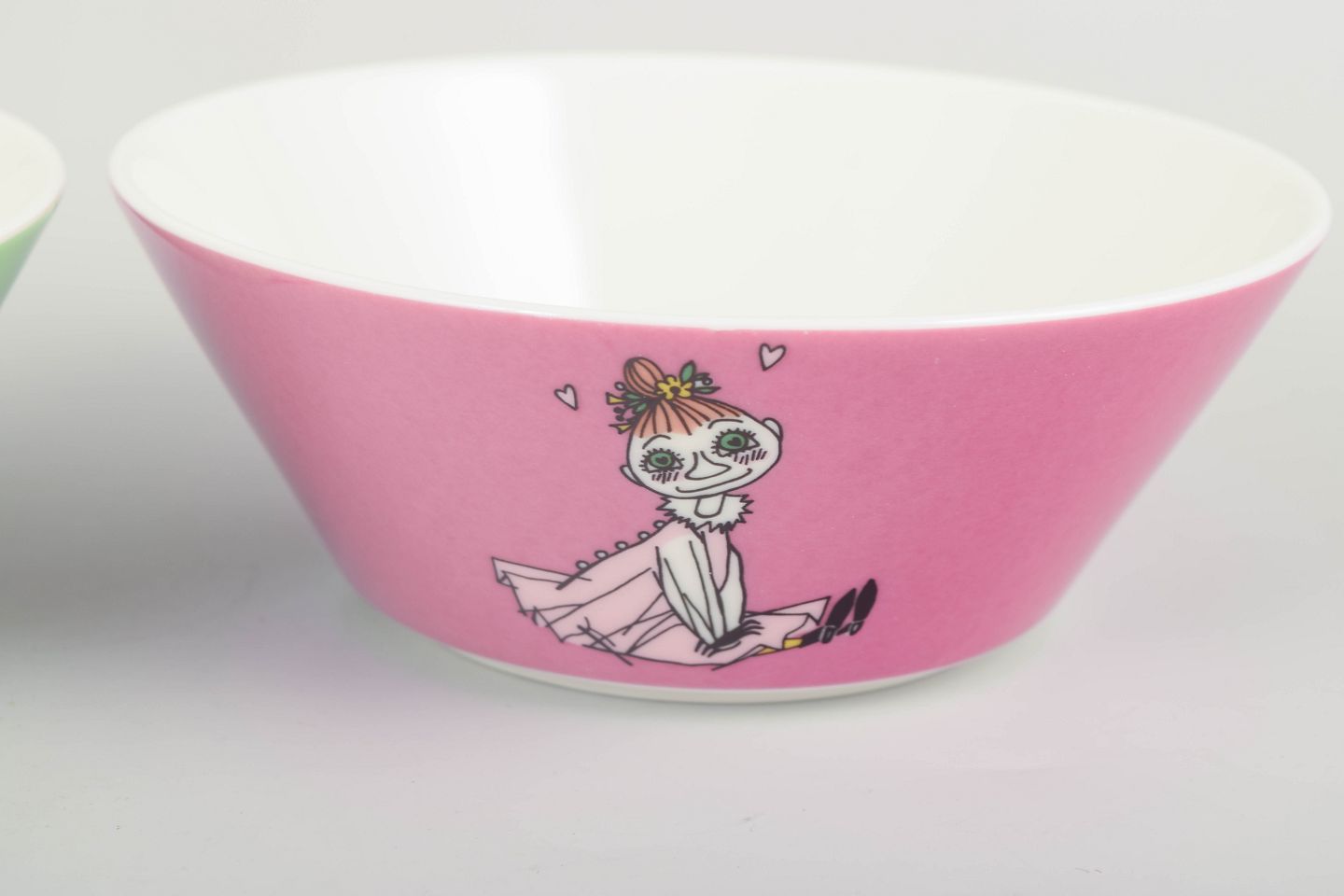To dekorative Mumi-skåle i porcelæn fra Arabia Finland, hver udsmykket med ikoniske figurer fra Tove Janssons univers.