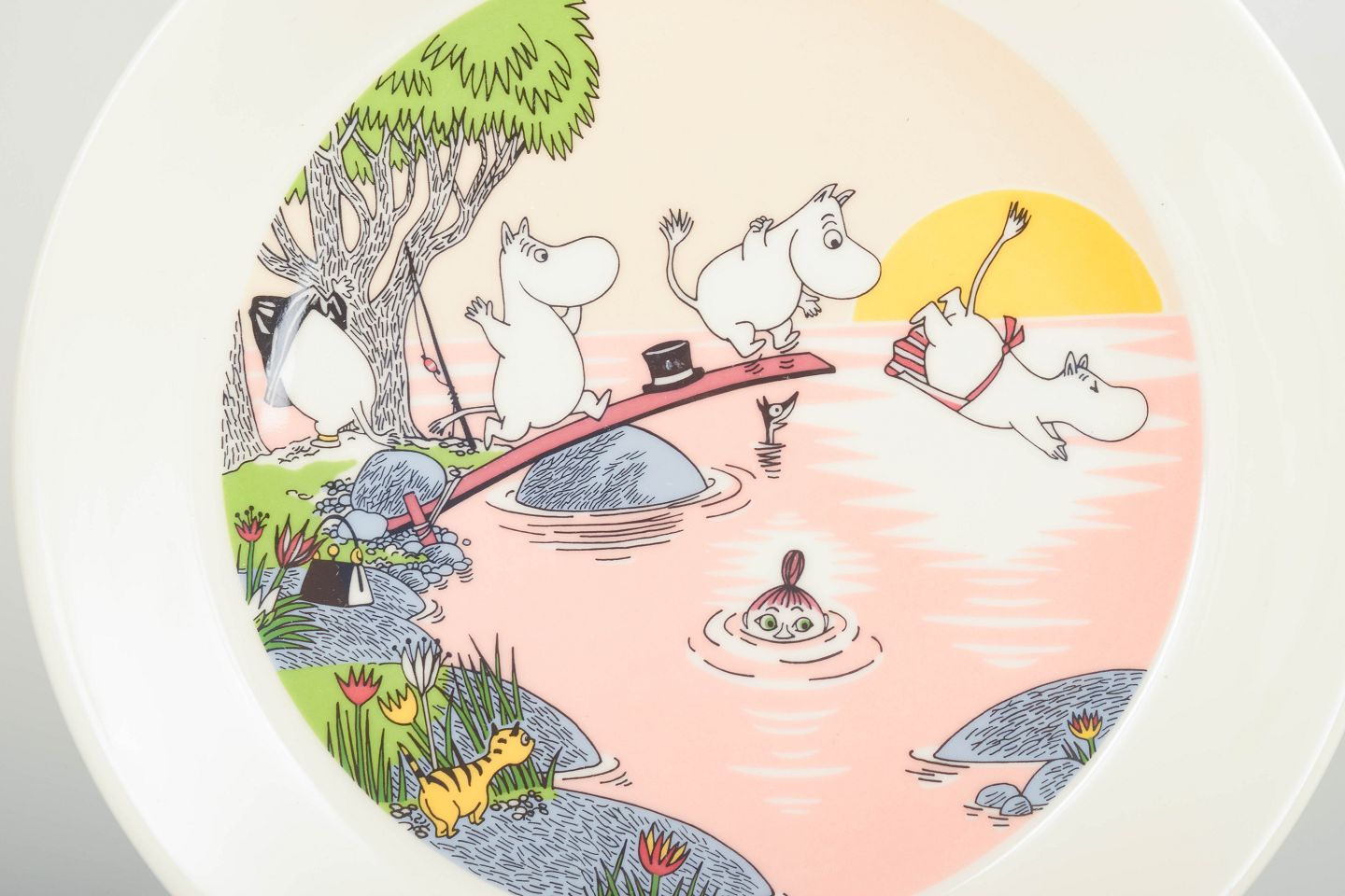 To dekorative tallerkener i porcelæn med klassiske Mumi-motiver, udført af Arabia Finland. Farvestærke illustrationer i tidstypisk grafisk stil.
