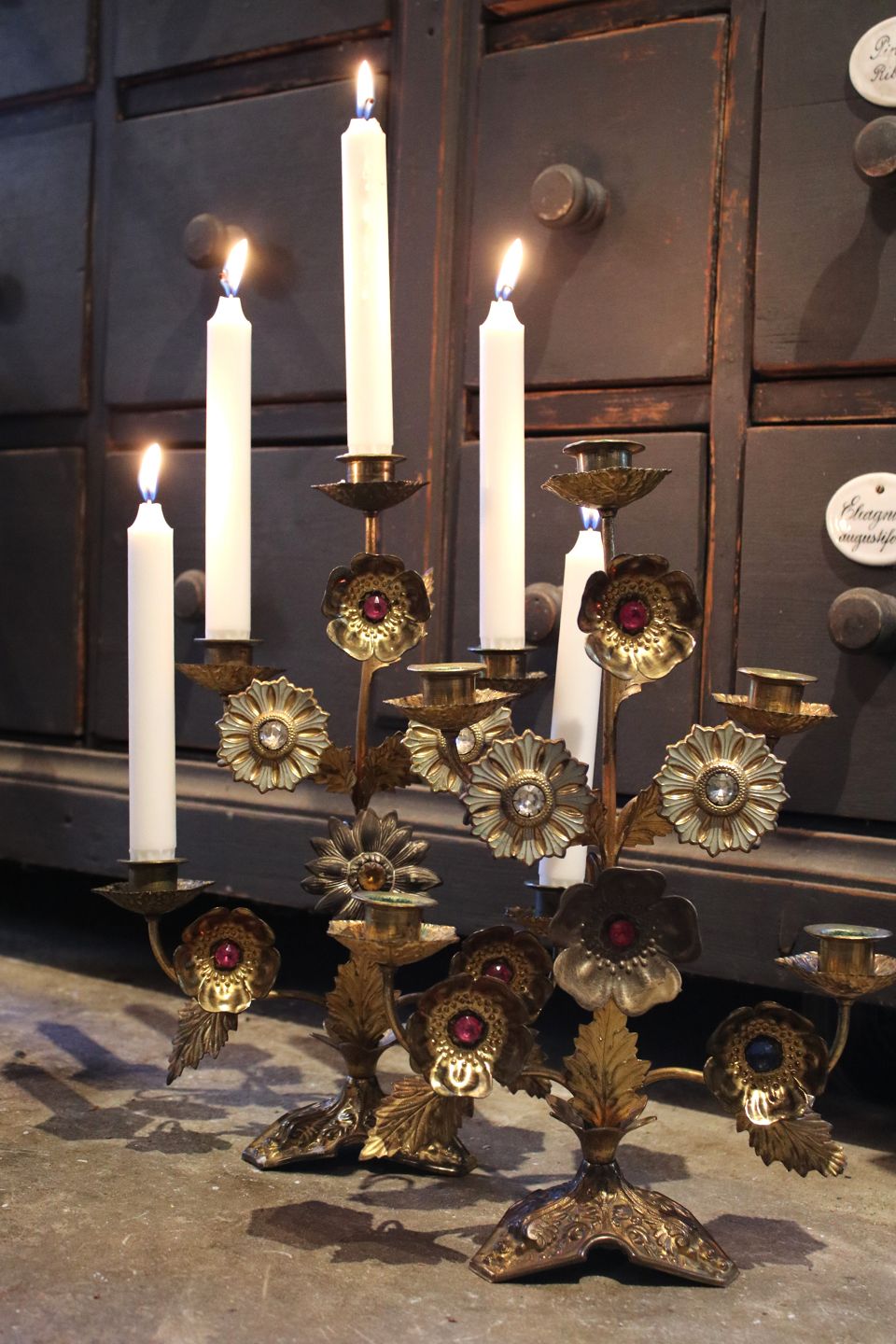 Antik , franske kirkelysestage i forgyldt metal dekoreret med 6 metalblomster med farvet sten...