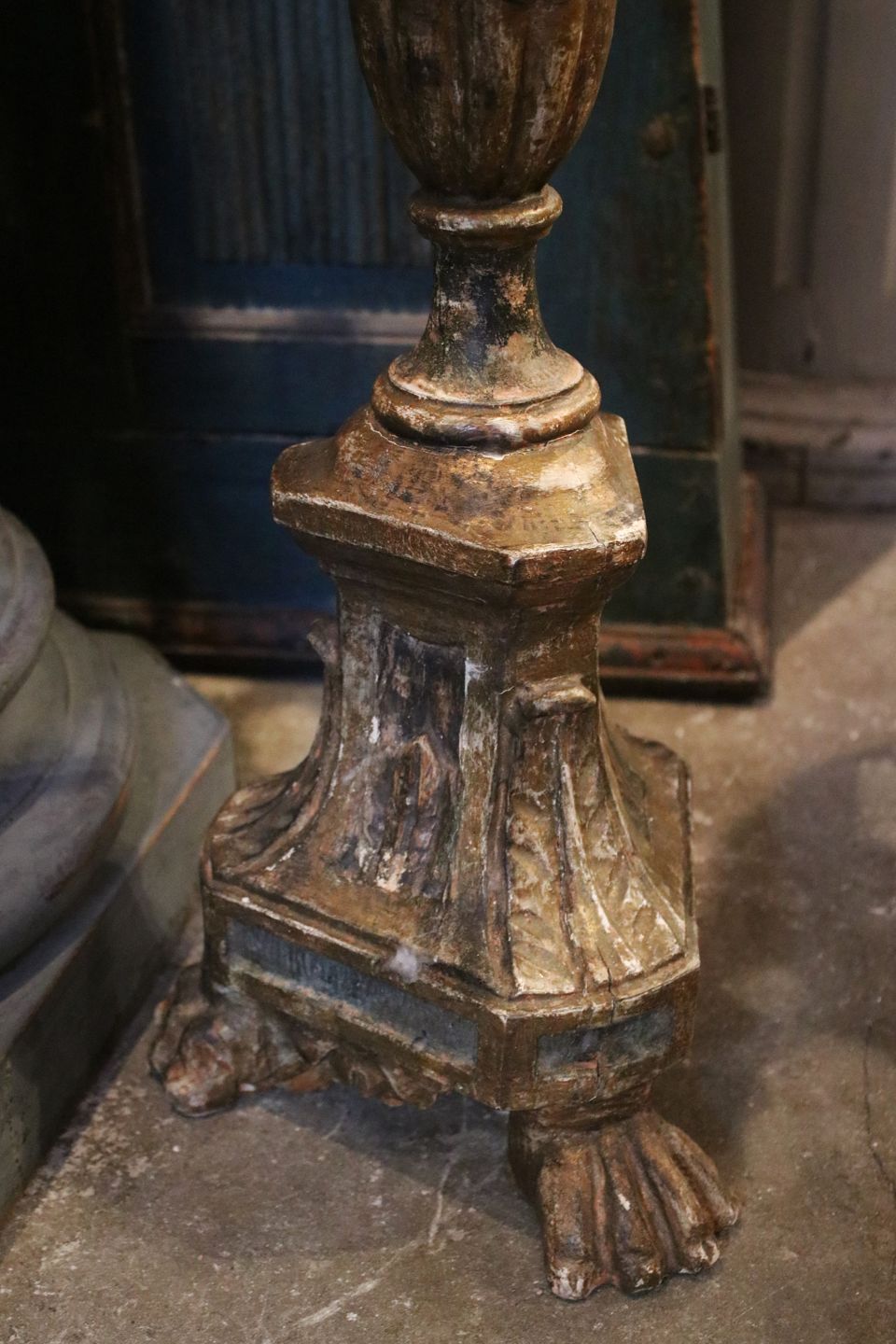 Antik , fransk 1800 tals gulv lysestage i udskåret træ med original bemaling...
