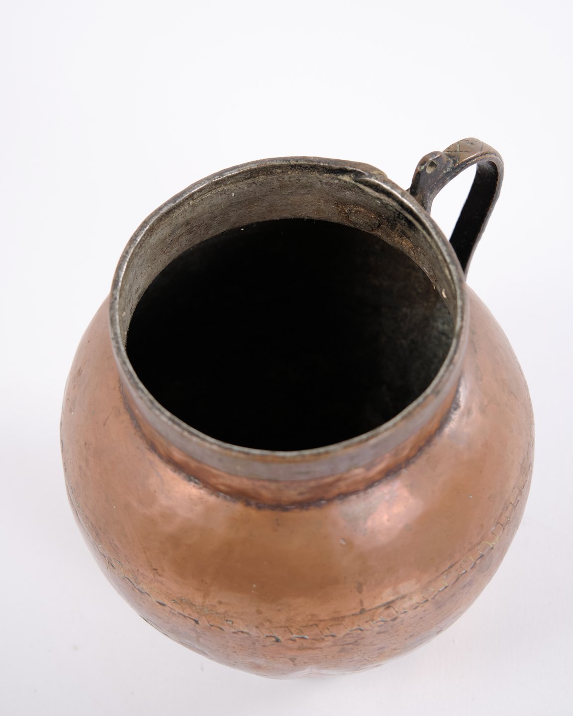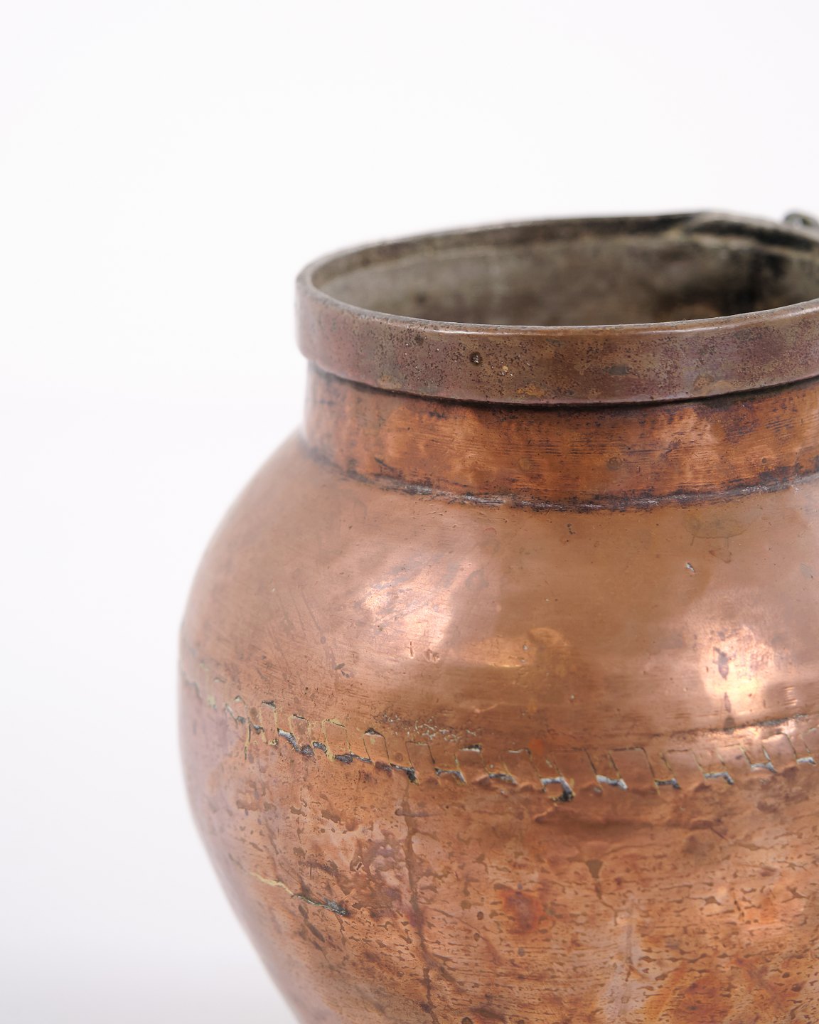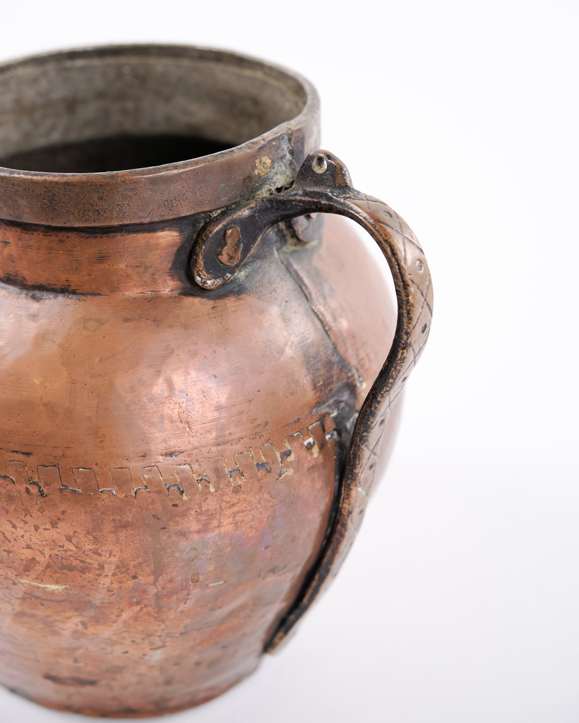 Håndlavet kobberkande fra 1800-tallet med solid hank og klassisk form. Dansk oprindelse. Velegnet som antik dekoration, samlerobjekt eller funktionel brugskande.