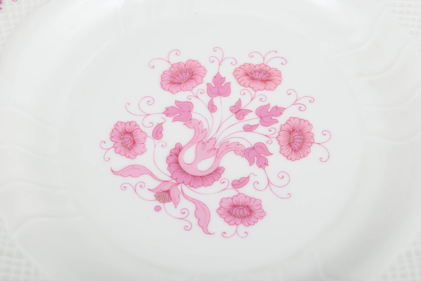 Sæt med seks fine tallerkener i porcelæn med lyserød blomsterdekoration og guldkant. Klassisk og elegant udførelse fra den ungarske porcelænsfabrik Hollóháza.