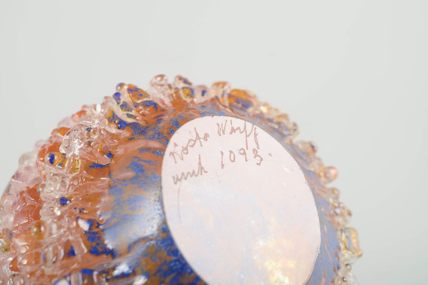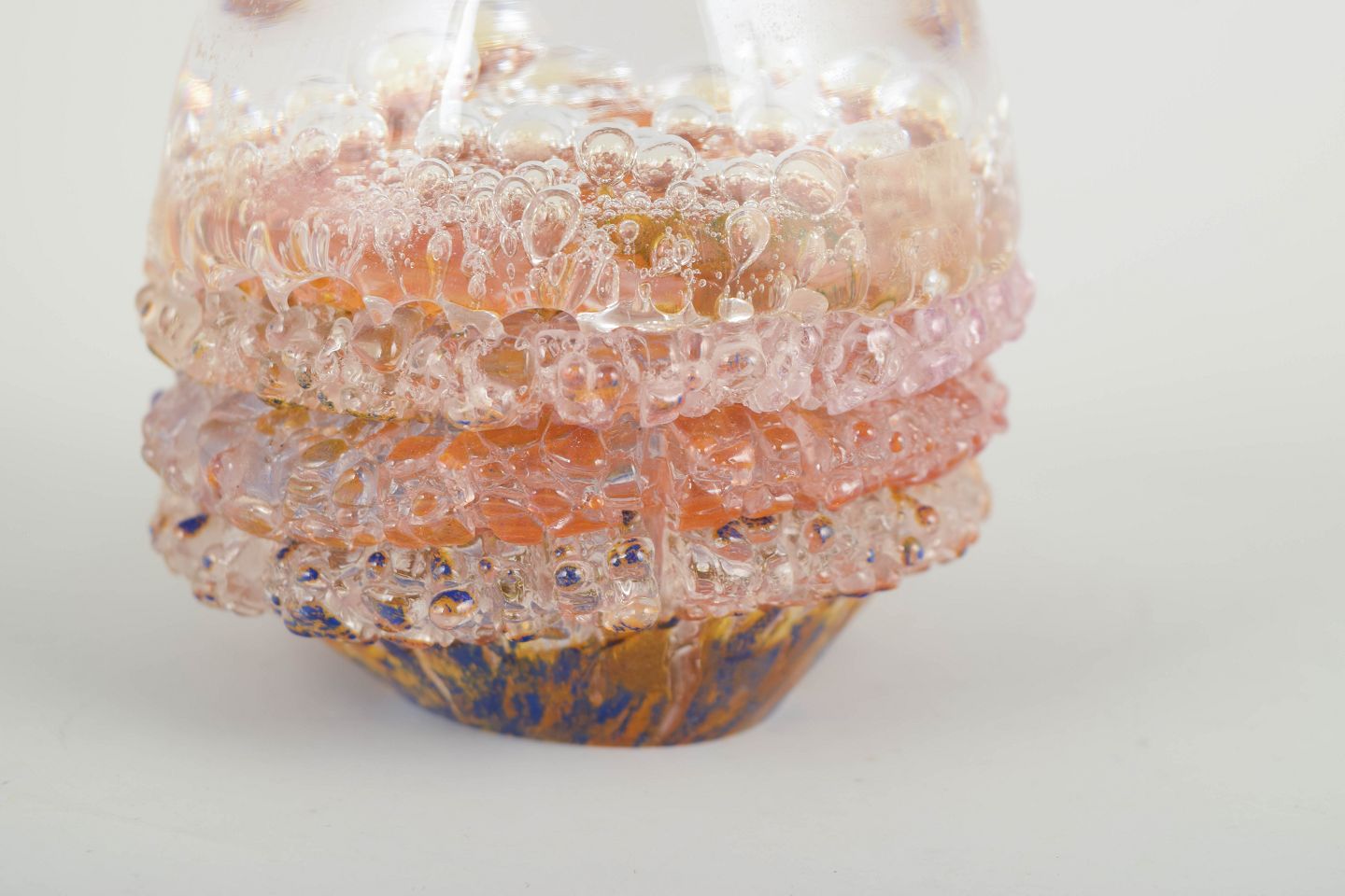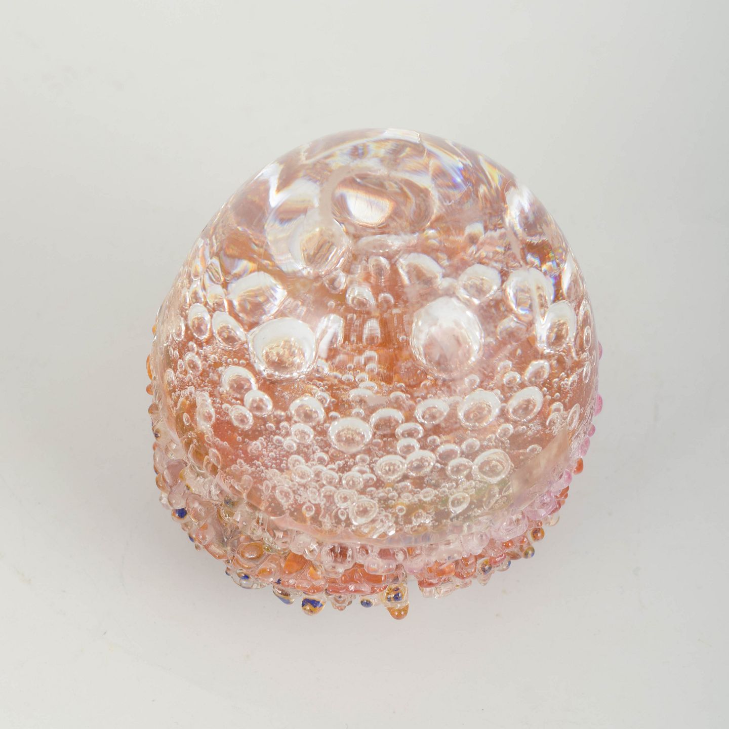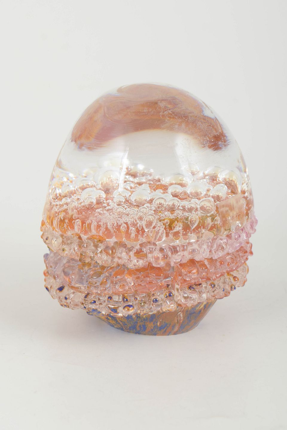 Organisk formet kunstglas-objekt med indkapslede luftbobler og lagdelte farvetoner i rosa, rav og klare nuancer.