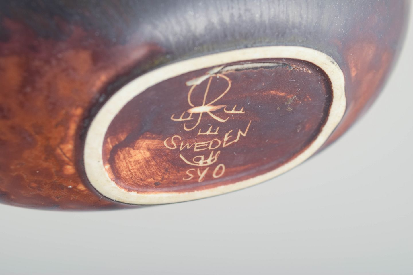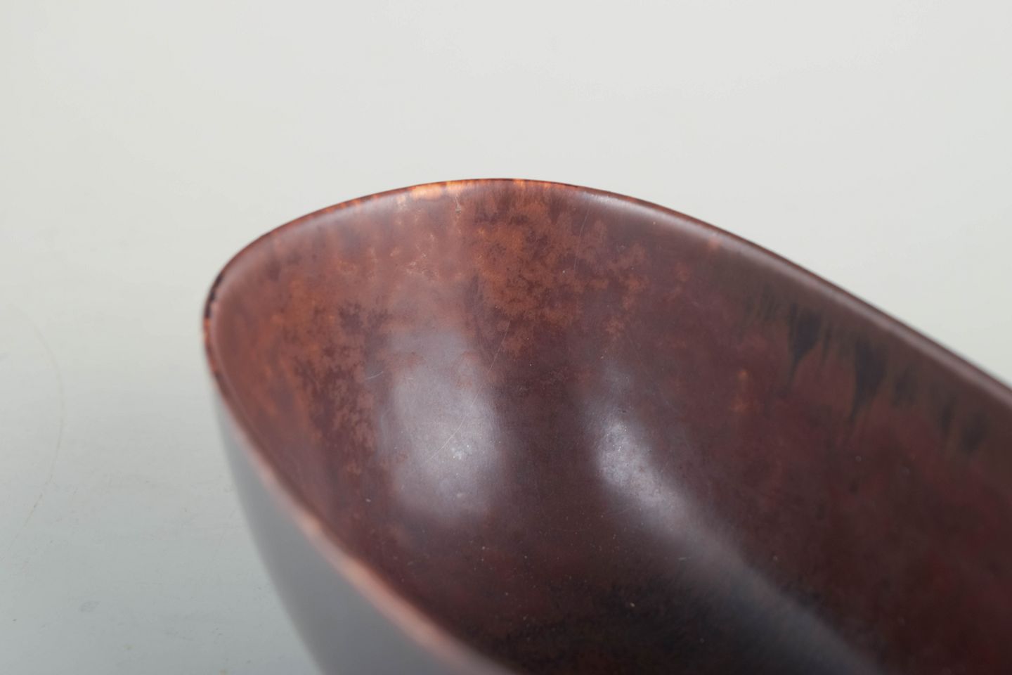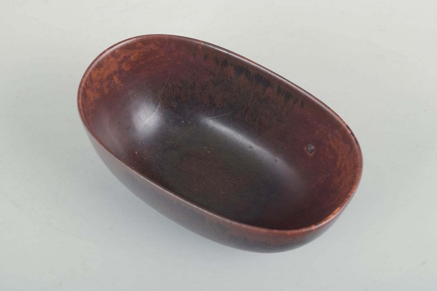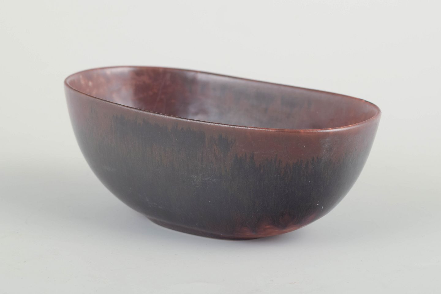 Ovalformet skål i stentøj med lav fod og rødbrun glasur med mørke løbende toner – et eksempel på Stålhanes elegante, reducerede formsprog og raffinerede glasurarbejde. Stemplet som 2. sortering.
