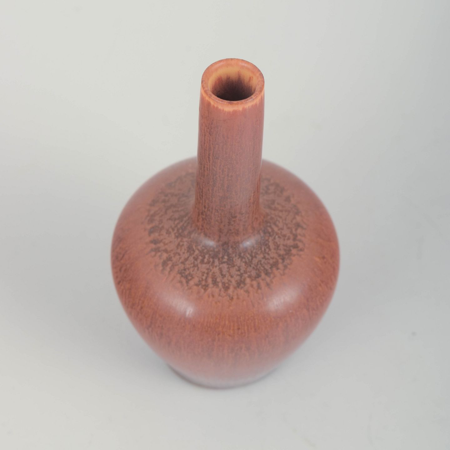 Lille, elegant vase i stentøj med rundet korpus og slank cylindrisk hals, dekoreret med en varm rødbrun glasur med nuanceret, let tekstureret overflade – et fint eksempel på Stålhanes formsikkerhed og subtile glasurarbejde.