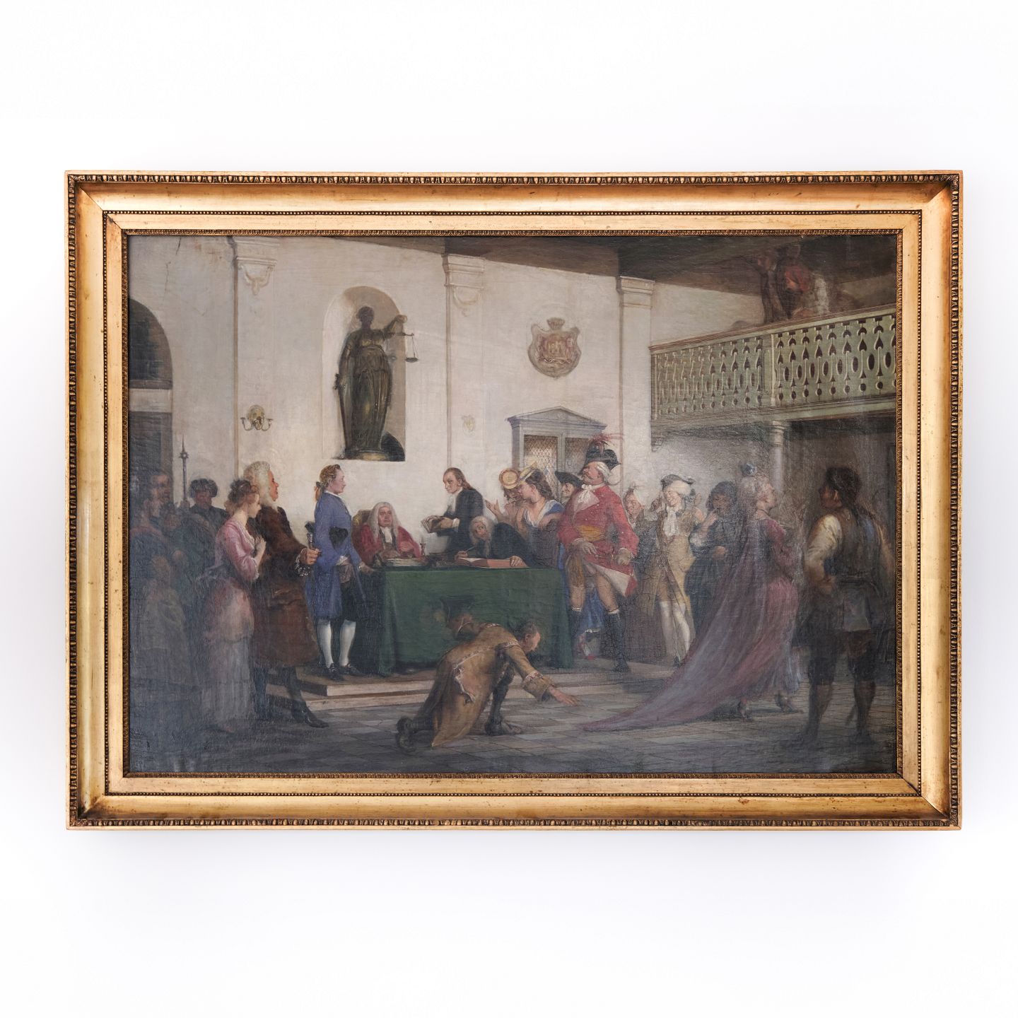 Olie på lærred tilskrevet Wilhelm Marstrand (1810–1873), udført som en scenisk fremstilling af afslutningen på Ludvig Holbergs komedie “Det Lykkelige Skibbrud”. Maleriet er usigneret og måler 95 x 135 cm. Ny Carlsberg Glyptotek ejer en anden version af motivet (90 x 127 cm), hvor både interiør og de afbildede personer adskiller sig fra dette eksempel. Nivaagaard ejer desuden en skitse til scenen, som viser både ligheder og variationer i forhold til de to malede versioner.