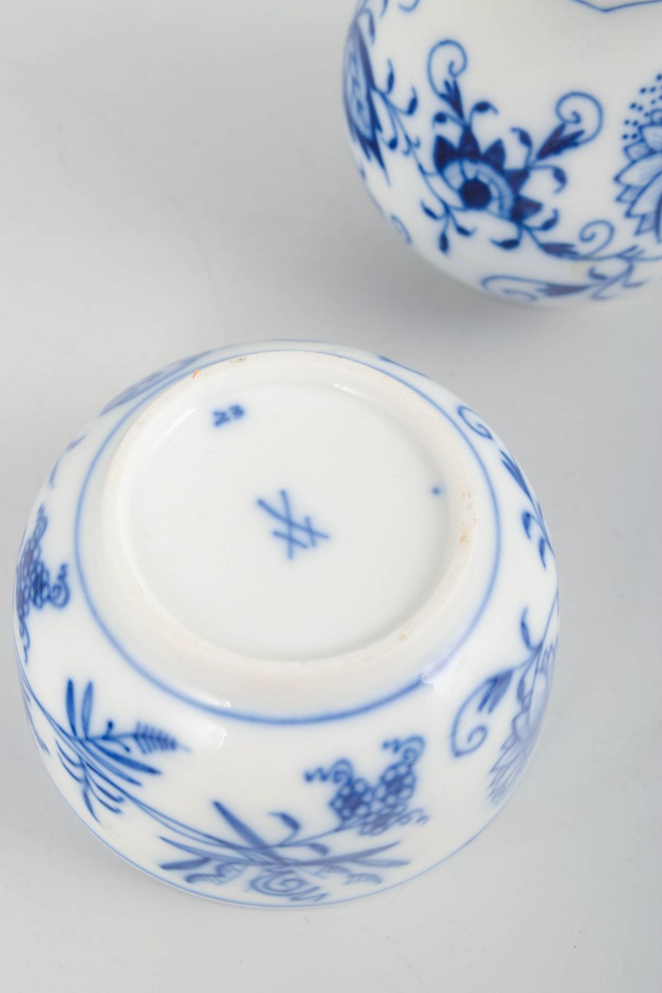 Et charmerende sæt bestående af en klassisk sukkerskål med låg samt en flødekande i det ikoniske løgmønstret (Zwiebelmuster). Begge dele er håndmalet i koboltblå underglasur og udført i de elegante former, der kendetegner Meissens tidlige 1900-tals produktion.