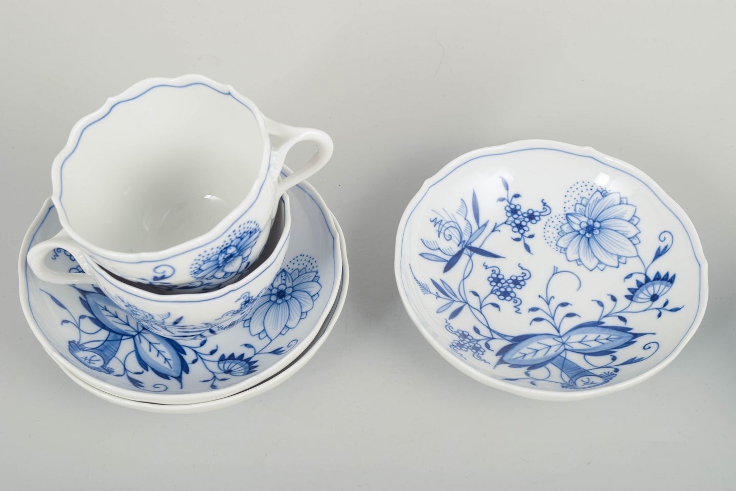 Meissen løgmønstret tre kaffekopper med tilhørende underkopper.