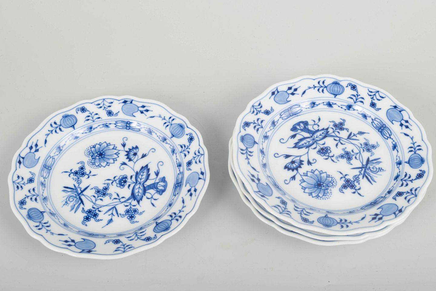 Sæt med fire Meissen tallerkener i det klassiske løgmønstret (Zwiebelmuster), håndmalet i koboltblå underglasur og med bølget kant.