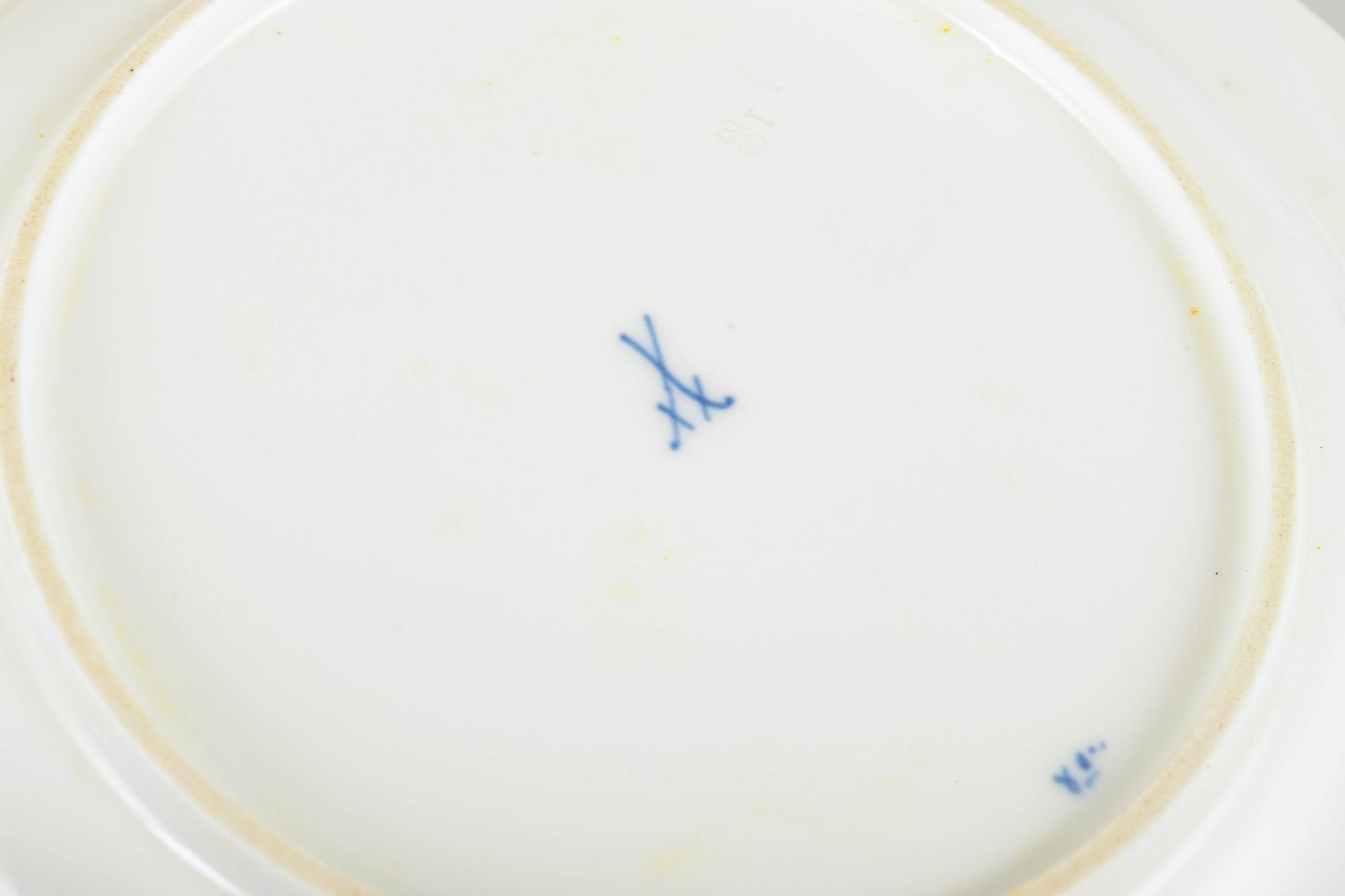 Fire klassiske Meissen-tallerkener i løgmønstret med bølget kant og håndmalet blå underglasurdekoration. Et tidligt 20.-århundredes sæt i fin kvalitet.