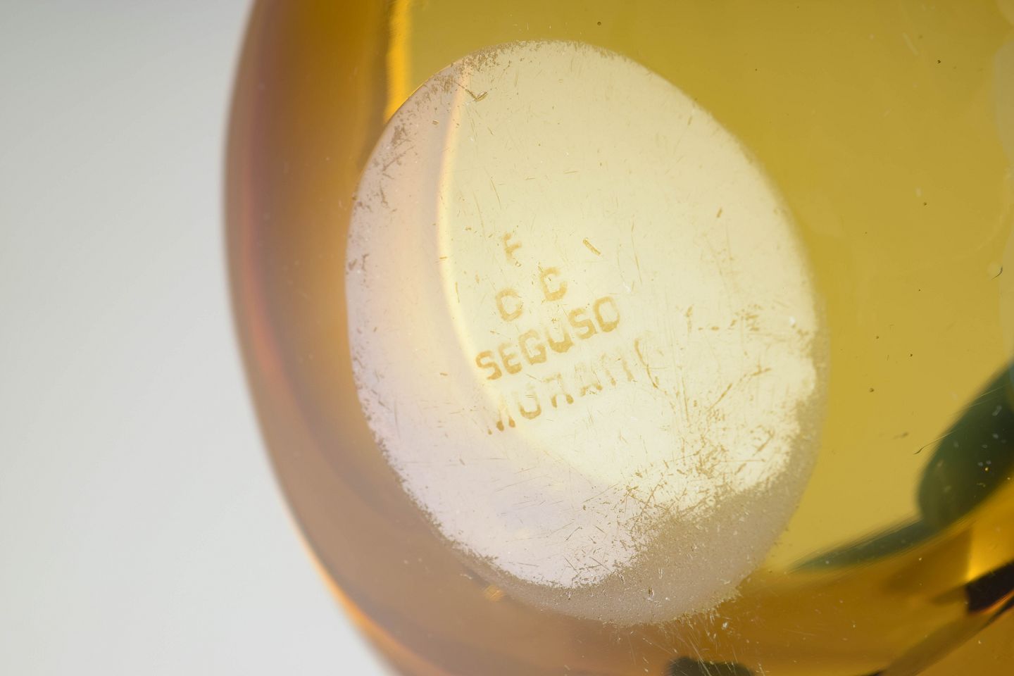 Seguso-navnet dækker over en af Muranos ældste og mest indflydelsesrige glasfamilier, med dokumenterede rødder tilbage til 1300-tallet. I midten af det 20. århundrede blev Seguso kendt for teknisk avancerede sommerso-arbejder, hvor farvede glaslag smeltes ind i et klart ydre for at skabe optisk dybde og elegante skulpturelle former.
