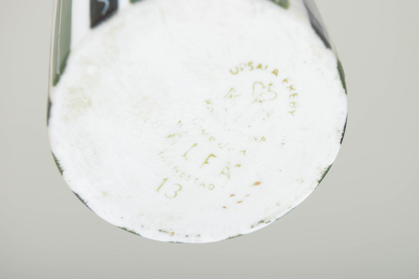 Upsala Ekeby Karlskrona var kendt for deres dekorative fajanceproduktion, hvor enkle former blev kombineret med levende håndmalede mønstre. Serien “Alfa” repræsenterer fabrikkens skandinaviske modernisme med fokus på farve, rytme og funktionel.