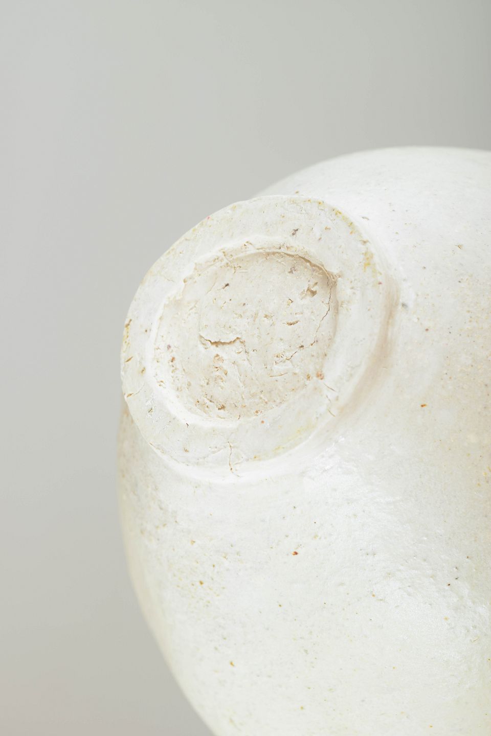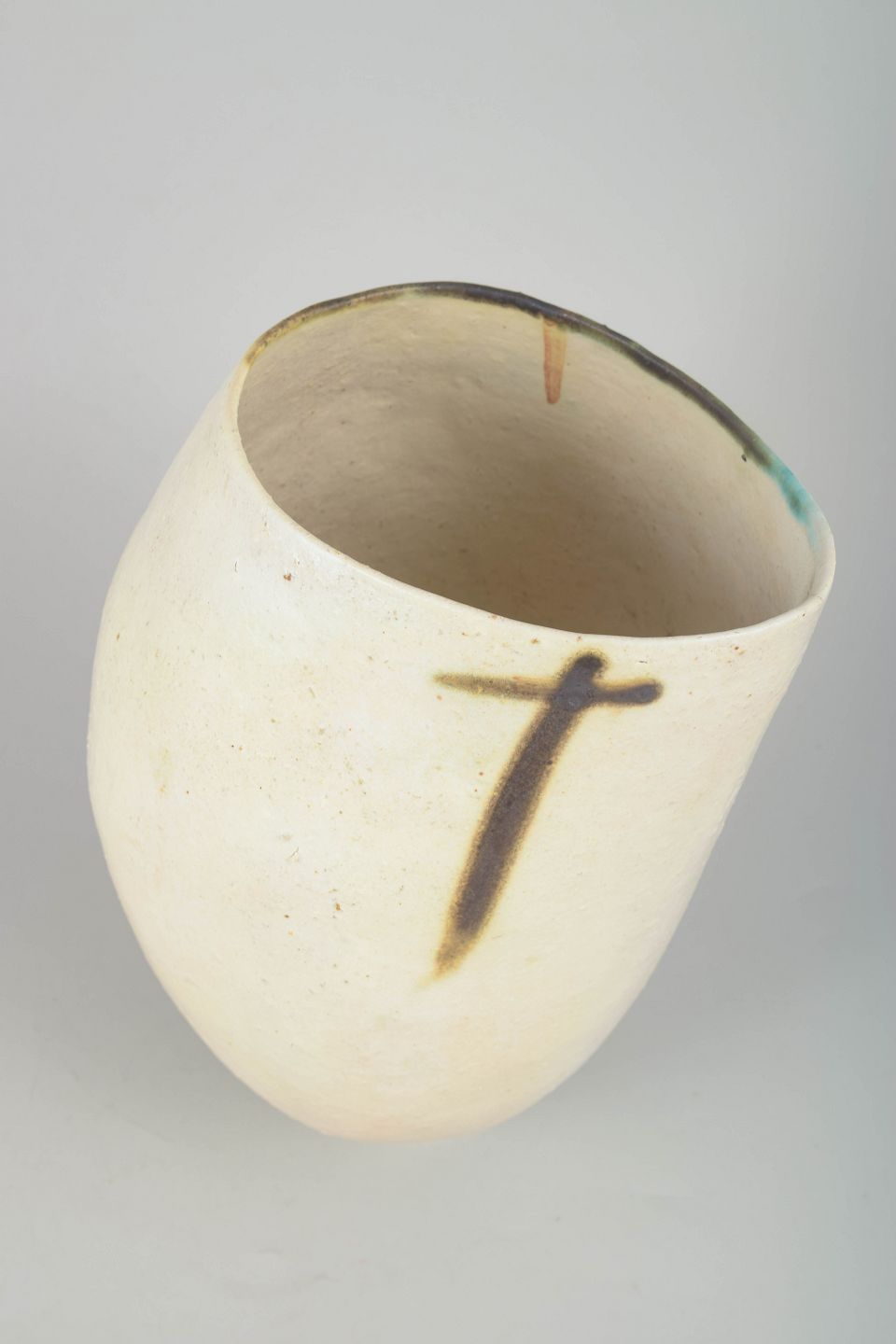 Skulpturel, håndbygget studiovase i stentøj med let asymmetrisk form, rå hvid overflade og minimalistisk penselstrøg-dekor i mørke brune og sorte nuancer.