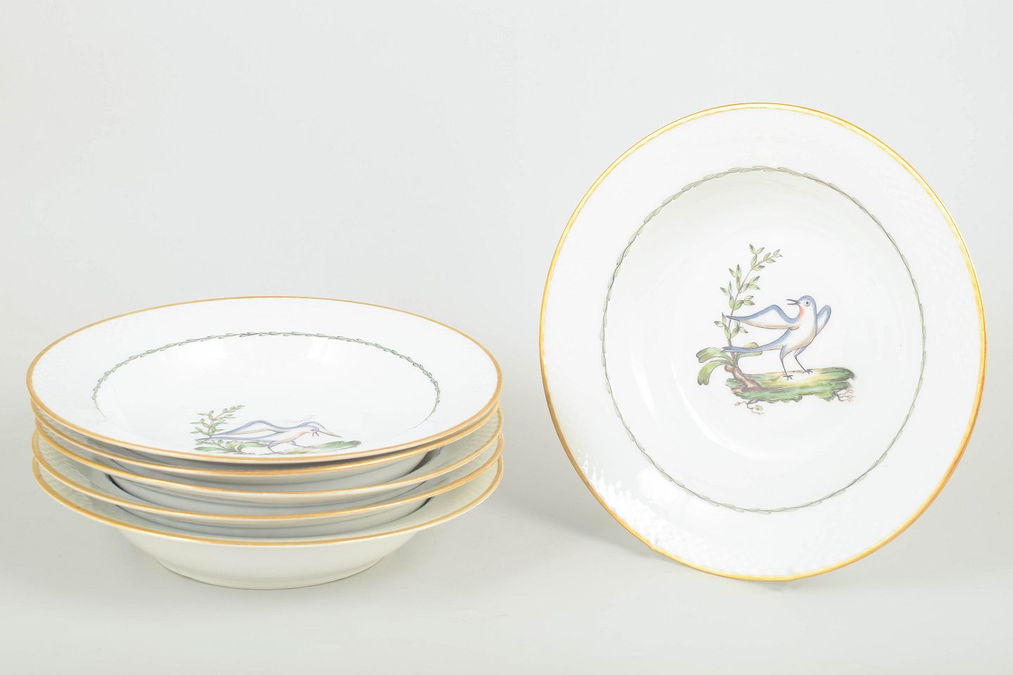 Sjældne dybe tallerkener i porcelæn fra Royal Copenhagen med motiv af fugle og botaniske elementer (model 550/8107). Hver tallerken er kantet med guldrand og har et elegant, let riflet fletrelief langs kanten.