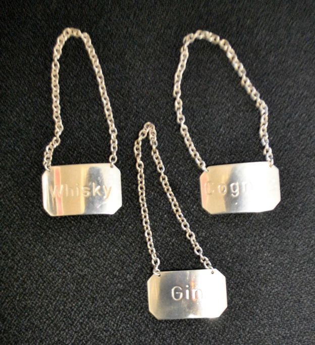Axel Holm Sølvsmedie (1967 - 1982) København: Sølv spiritus mærker, 20. årh. Sterling sølv. Stemplet. Til whisky, cognac og gin. 2,5 x 4,5 cm.