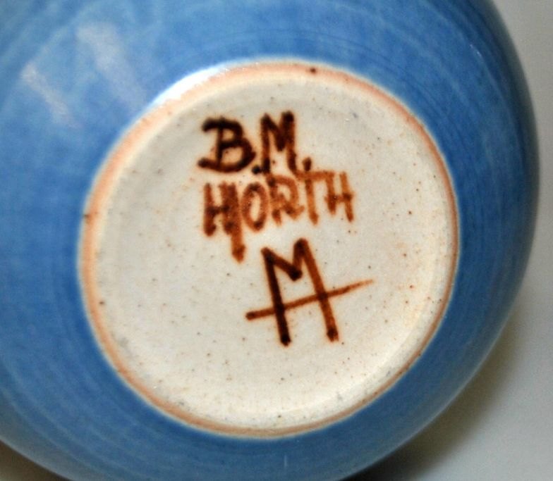 Hjorths keramik, 20. årh. Bornholm, Danmark. Unika skål. Stentøj. Med dekoration på siderne. Gårblå glasur. Stemplet: B.M., Hjorth og monogram M.. H.: 8 cm.