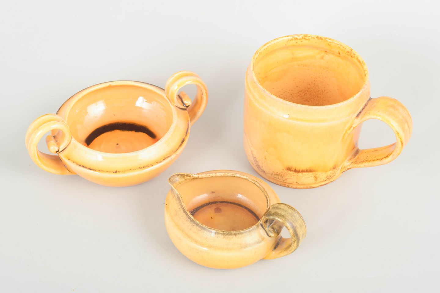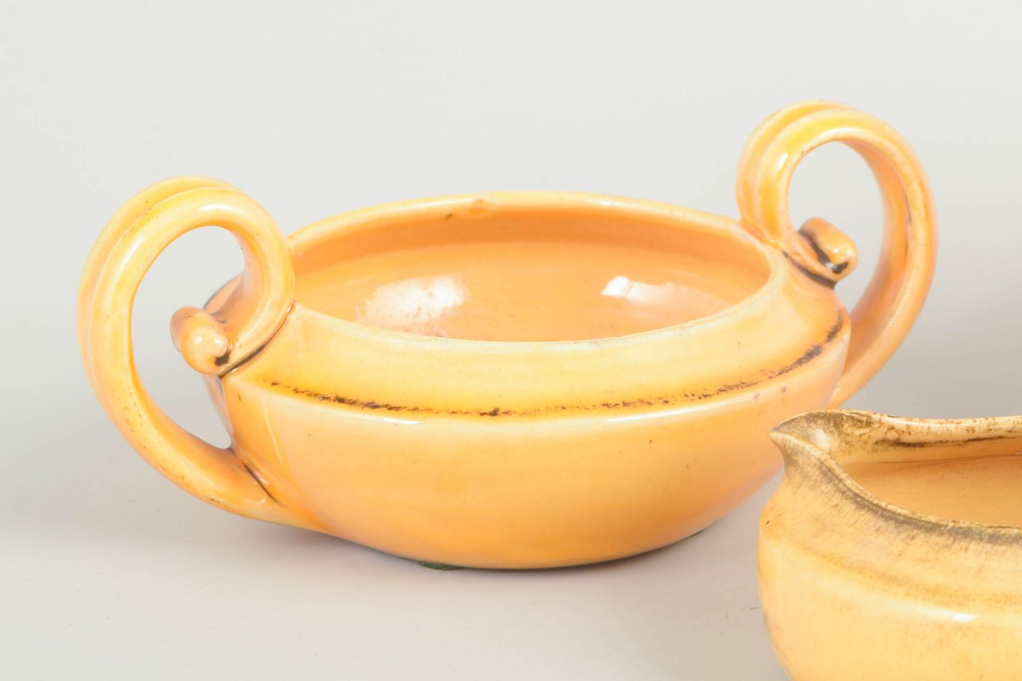 Tre dele i den klassiske Kähler-palette af varme gul-orange glasurer fra 1930’erne. Sættet består af en lille flødekande med dekorativt svunget håndtag, en sukkerskål med dobbelthanke i spiralform samt et større krus/bæger med markant hank. Fine proportioner og karakteristisk håndværkspræget formsprog.