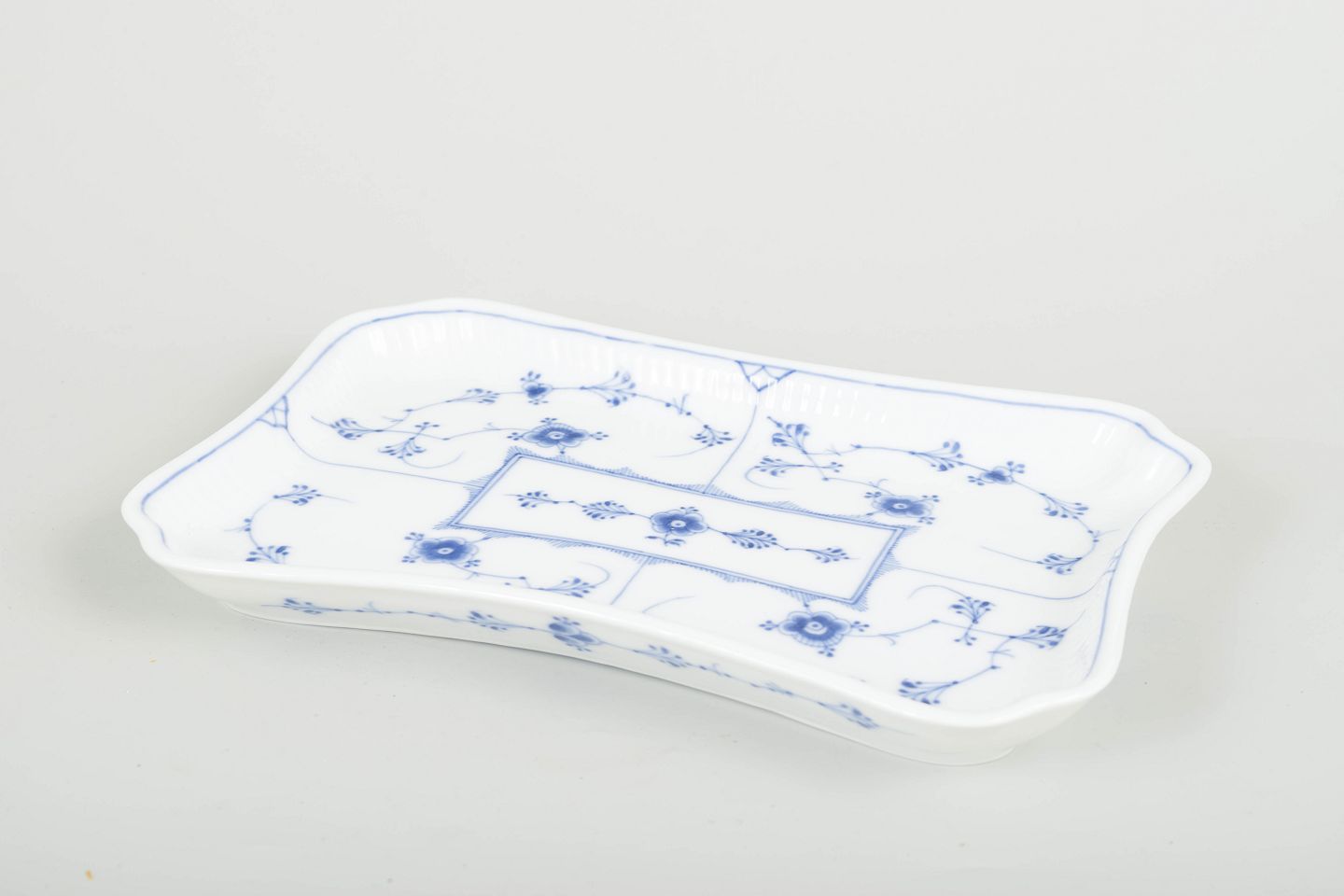 Elegant rektangulær bakke i musselmalet riflet porcelæn, med blødt svungne kanter og klassisk håndmalet koboltblå dekoration på riflet korpus. En smuk og sjældnere form fra Royal Copenhagens tidlige 1900-tals produktion.