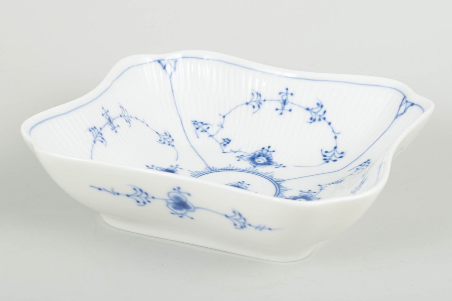 Elegant firkantet skål i musselmalet riflet porcelæn med let bølgede kanter og håndmalet koboltblå dekoration på riflet korpus.