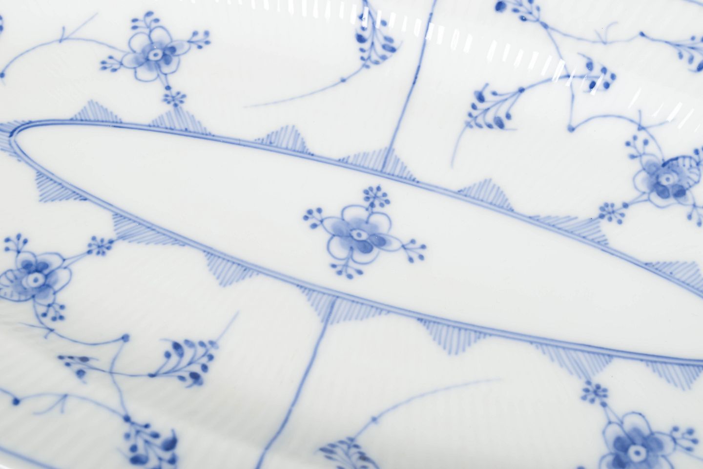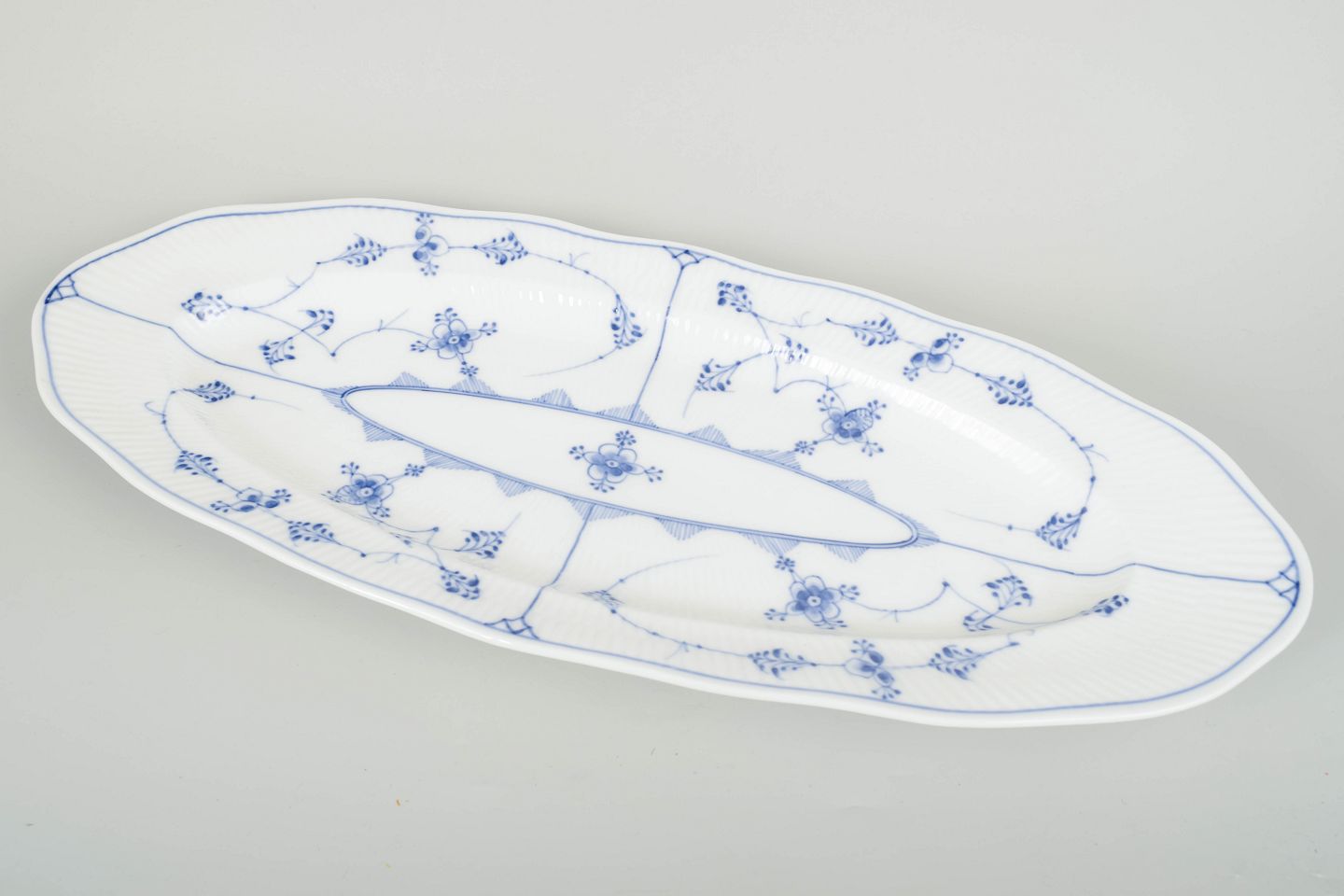 Stort og elegant fiskefad i klassisk musselmalet riflet porcelæn med håndmalet blå dekoration og riflet korpus. Den aflange form og det rige mønster gør fadet til et markant og dekorativt serveringsstykke fra begyndelsen af det 20. århundrede.