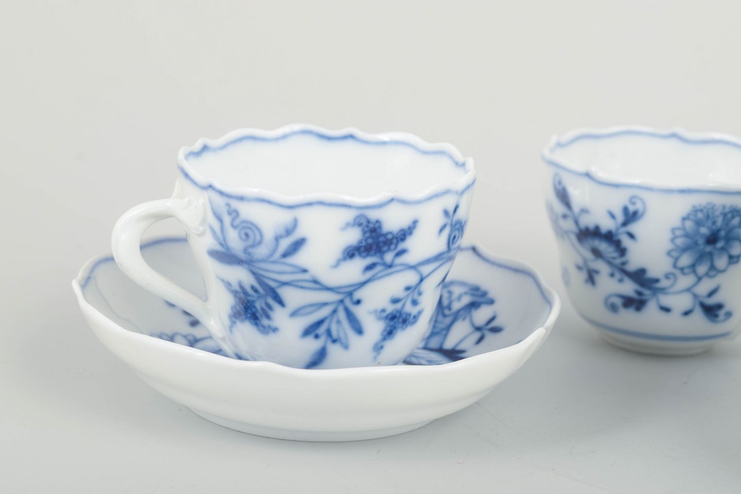 Håndmalet i de klassiske “løgmønstret” (Zwiebelmuster) blå-hvide dekoration med bølget kant og fint reliefporcelæn.