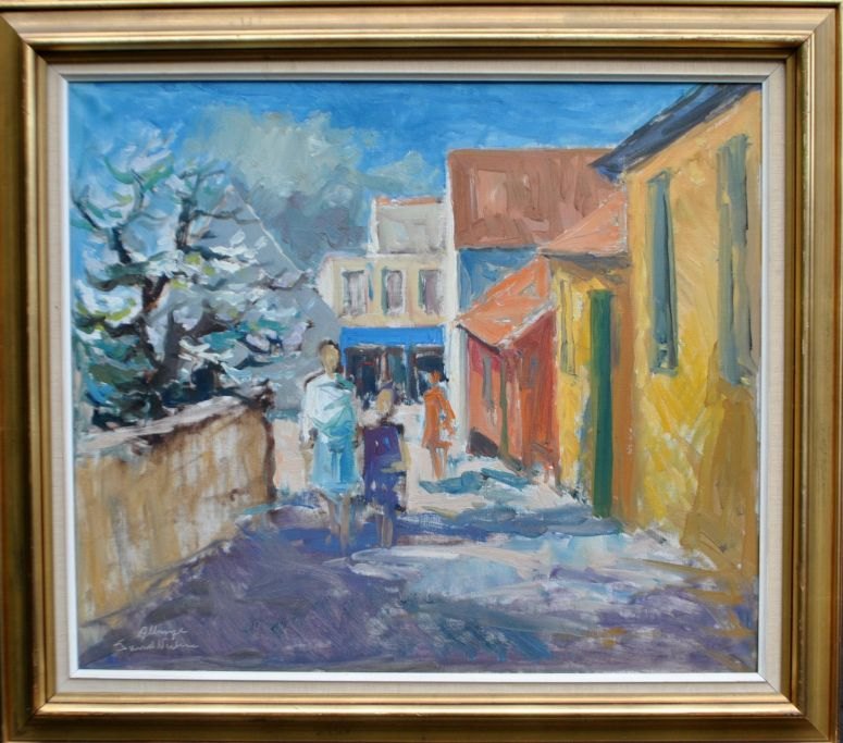 Nielsen, Svend (1908 - 1993) Danmark: Scene fra Allinge. Bornholm. Olie på lærred. Signeret. 60 x 70 cm.