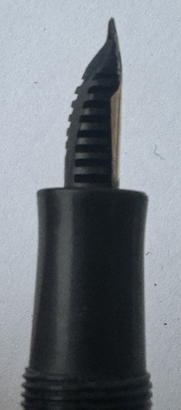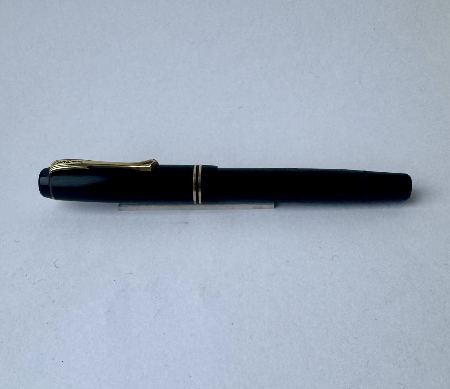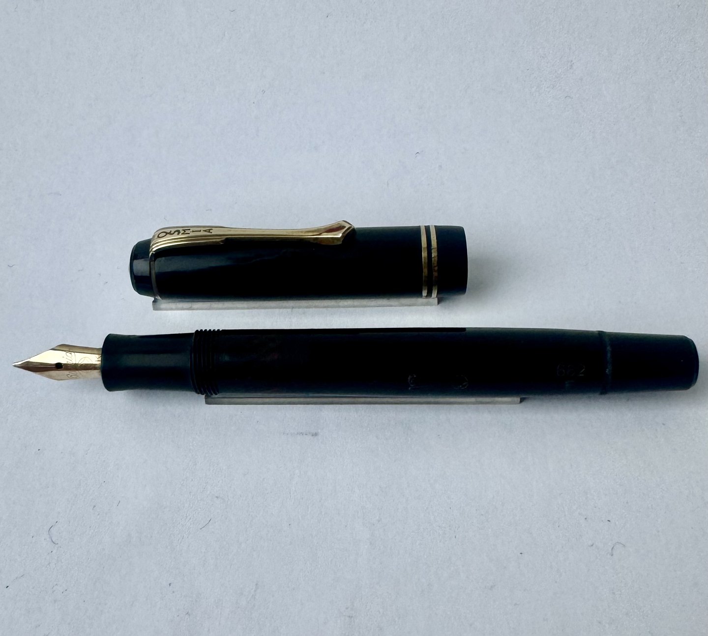 Sort Osmia fyldepen med piston blæk påfylder, der skal repareres før end fyldepennen igen kan optage blæk og skrive igen. Fremstår i god stand uden skader. Alle dele originale til denne model inklusiv en Osmia nummer 2 guldspida i 14 karat. Længde: 11,5 cm