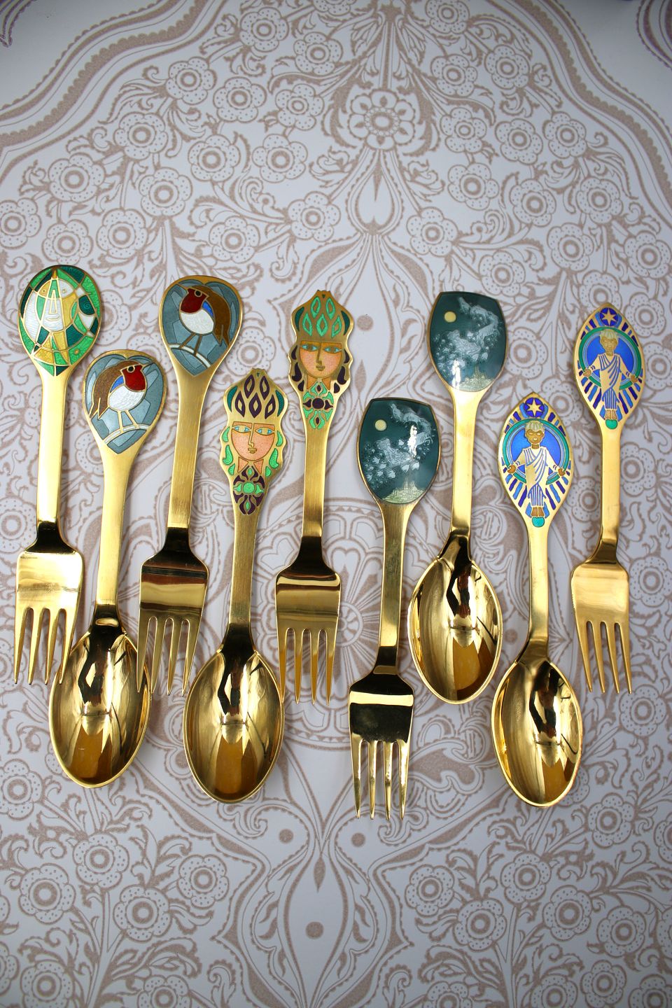 i forgyldt sølv med emalje jule motiver.