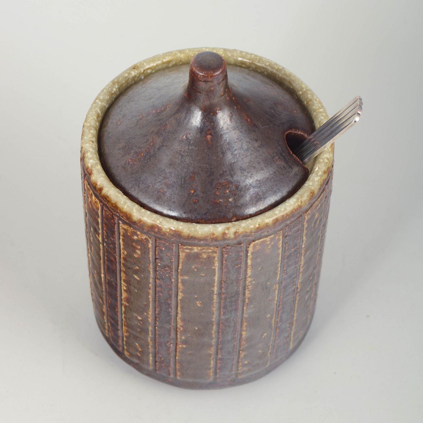 Hånddrejet stentøjskrukke med fast låg i brun Palshus-glasur og karakteristisk lodret rillet dekoration. Indhak til ske.